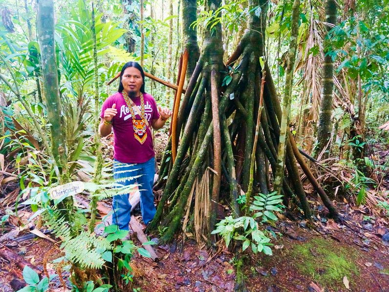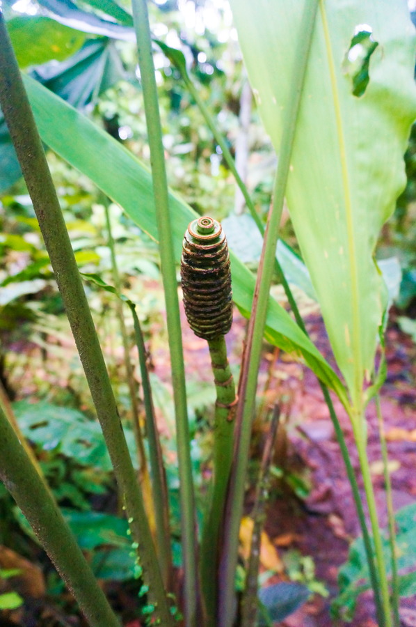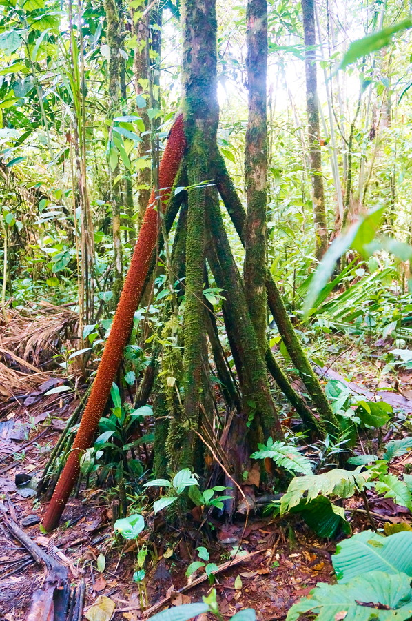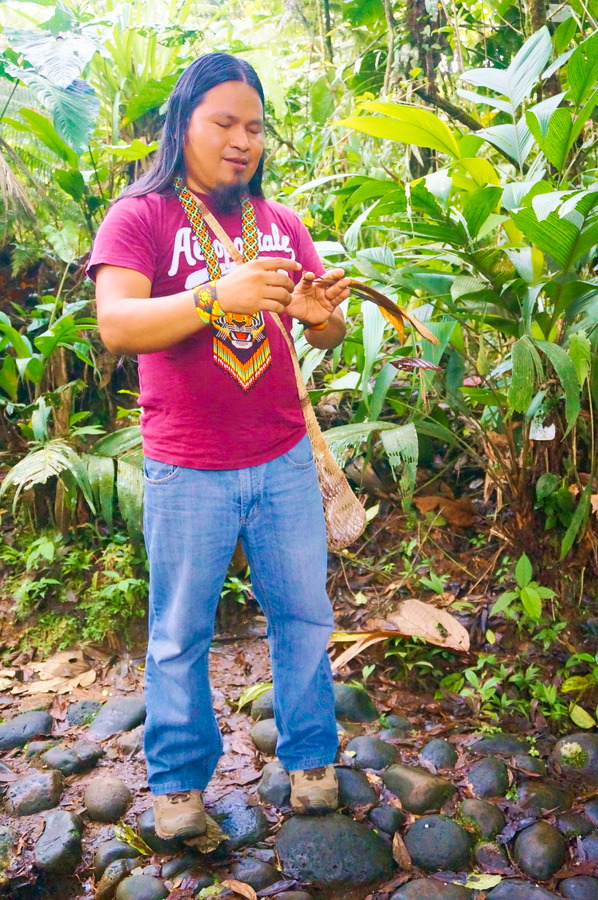 A Puyo, sur l’autre rive du Rio Puyo, se trouve le parc etnobotanique Omaere accessible grâce à une jolie petite passerelle qui enjambe la rivière. Il fut fondé en 1993, sur une surface de quinze hectares qui était dédiée aux pâturages et à la culture intensive de canne à sucre. Deux Français, un Américain et des populations indigènes comme les Guaranis et les Chuars entreprirent de planter des arbres endémiques sur cette surface et il est impressionnant de voir, après un petit quart de siècle, à quel point la nature a repris ses droits. José, notre guide appartenant à la communauté indienne des Chuars, nous explique les différentes vertus médicinales des plantes qu’on peut trouver dans la forêt ainsi que les traditions de son peuple. C’est fou comme la médecine occidentale nous a un peu éloignés des plantes et de leurs vertus! Malheureusement, un bon gros orage tropical nous force à interrompre la visite. Ça nous aura permis de mettre à l’épreuve notre matériel contre la pluie qui a passé le test haut la main! Et puis, nous trouvons que la forêt tropicale (ou équatoriale ici) est bien plus belle sous la pluie et juste après l’averse quand tout est encore humide. En plus, ça sent hyper bon!