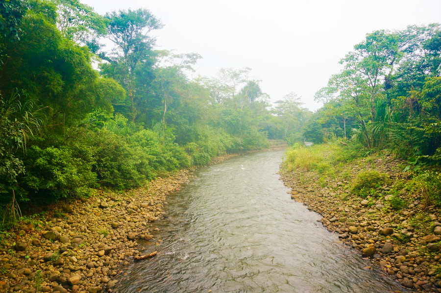 Depuis Baños, qui se situe déjà sur le versant oriental des Andes, du bon côté donc, il ne nous faut pas plus de deux heures de bus pour rejoindre Puyo. Heureusement pour nous, le trajet a été bien moins chaotique que la dernière fois, et le chauffeur n’a pas confondu la route avec un circuit de course automobile! Nous sentons que nous avons totalement changé d’environnement, l’atmosphère se fait plus lourde, plus humide, plus chaude (enfin!) et la végétation est très dense et très luxuriante. Bienvenue en Amazonie!