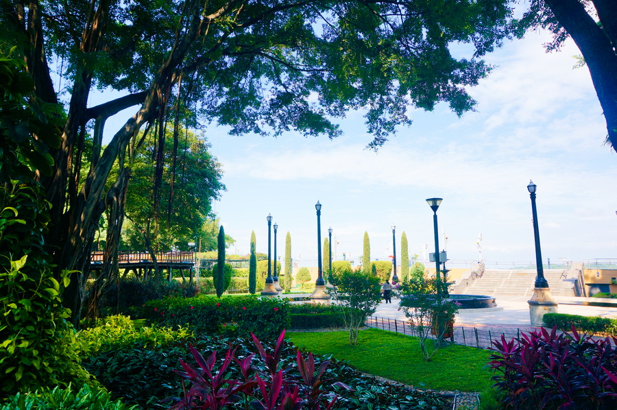 Toute ville sud-américaine au bord de l’eau qui se respecte se doit de posséder un malécon, c’est à dire une promenade en bord de mer, de lac ou de fleuve, bref au bord de l’eau. Guayaquil n’échappe pas à la règle. Le Malécon longe le Rio Guayas sur deux kilomètres et demi et c’est une vraie bouffée d’air frais. Les courants du fleuve venus tout droit de l’océan Pacifique tempèrent la chaleur très humide de la ville. On y trouve de tout : des centre commerciaux, des cinémas, des restaurants en tous genres, quelques monuments, des espaces verts, etc… C’est un bel endroit pour flâner dans une zone entièrement piétonne loin du trafic infernal de la ville. Le seul bémol, c’est la musique (principalement le reggaeton qu’on déteste de toutes nos forces!) ou la publicité diffusées à coin depuis des enceintes géantes. Ça casse le côté promenade tranquille du malécon et transforme le coin en discothèque géante tout au long de la journée. Nous trouvons cela vraiment dommage mais, après quelques mois passés sur ce continent, nous commençons à remarquer que se promener au calme est plutôt un truc d’Européens. Les Américains préfèrent être toujours accompagné d’un bruit de fond peu importe l’endroit où ils se trouvent.