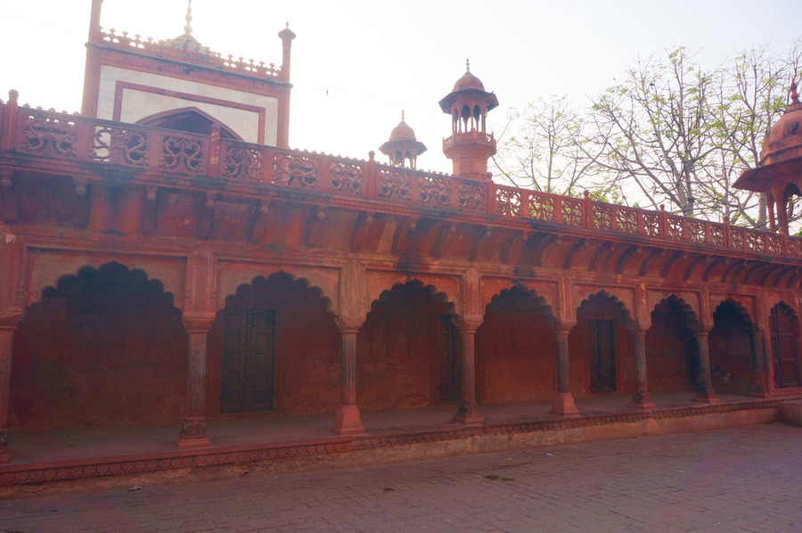 La mosquée Fatehpuri une petite mosquée, également construite en grès rouge, que nous croisons au détour d’un chemin. Elle a été vendue aux enchères pendant les révoltes populaires de 1857 pour finalement tomber dans les mains du gouvernement qui restitua le bâtiment à la communauté musulmane d’Agra. Sachant que la majorité hindoue malmène les musulmans, ce geste symbolique nous met un peu de baume au cœur.