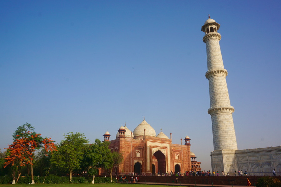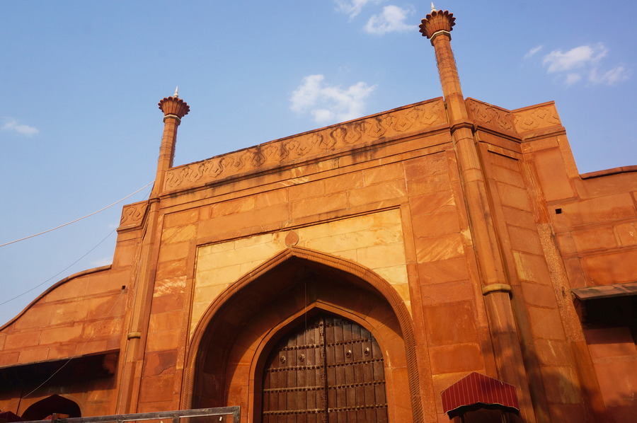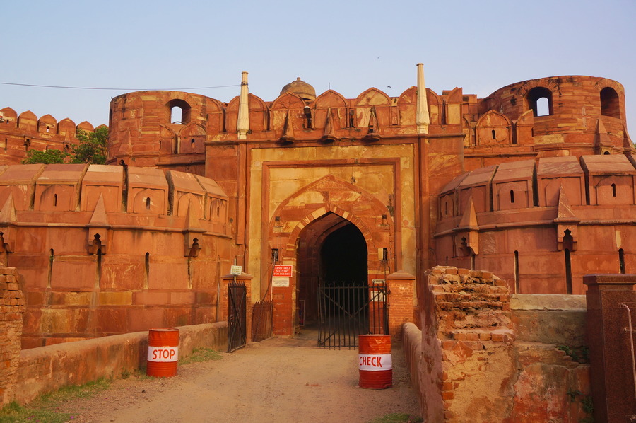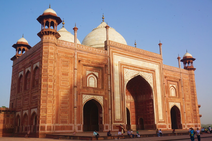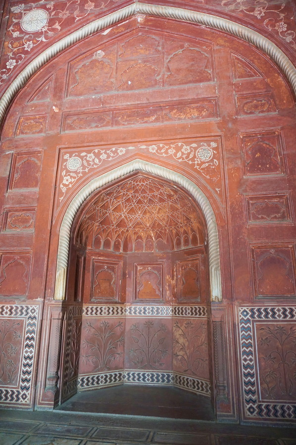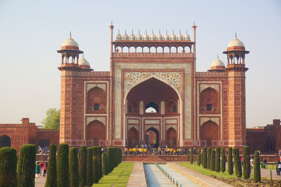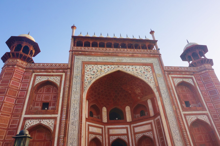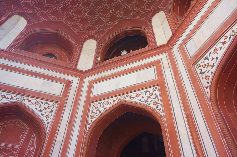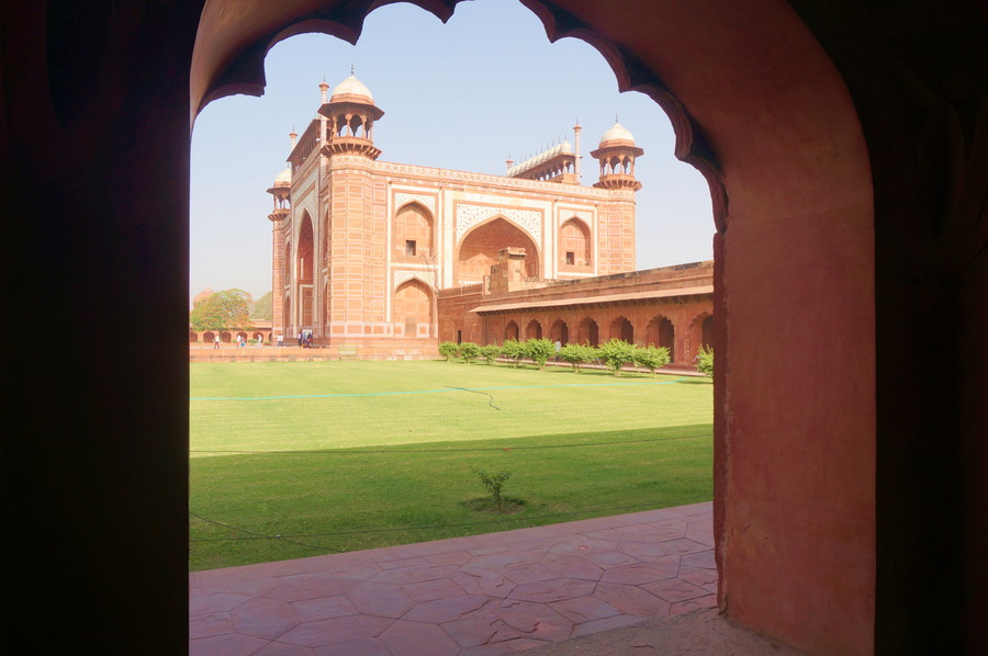 Comme partout, il faut pénétrer sur le site en passant par la porte d’entrée, même en Inde où ils ne font rien comme tout le monde. Mais cette porte là en jette particulièrement. Elle en impose avec sa façade de grès rouge ponctuée de mosaïques en marbre blanc et son style architectural perse.