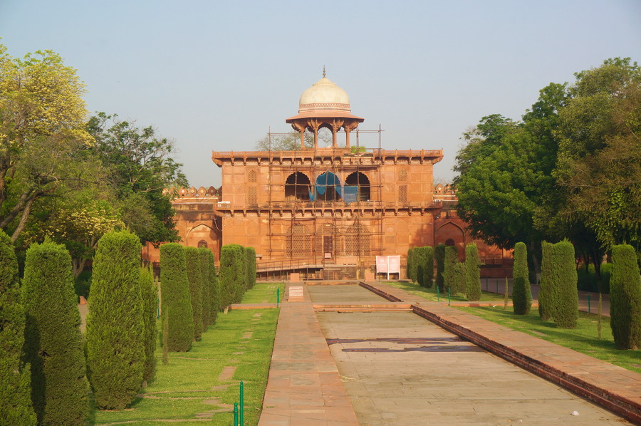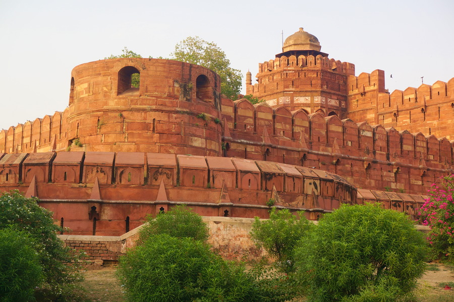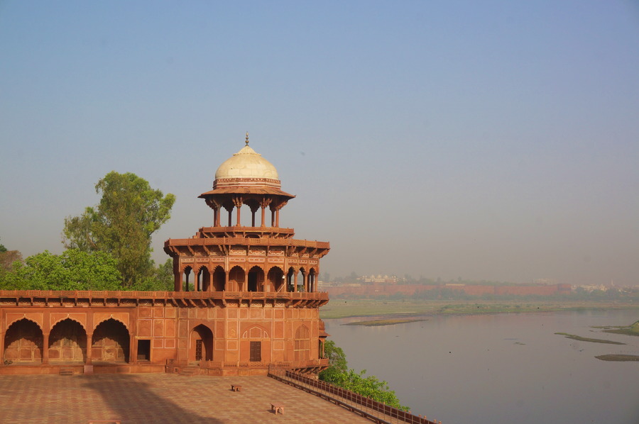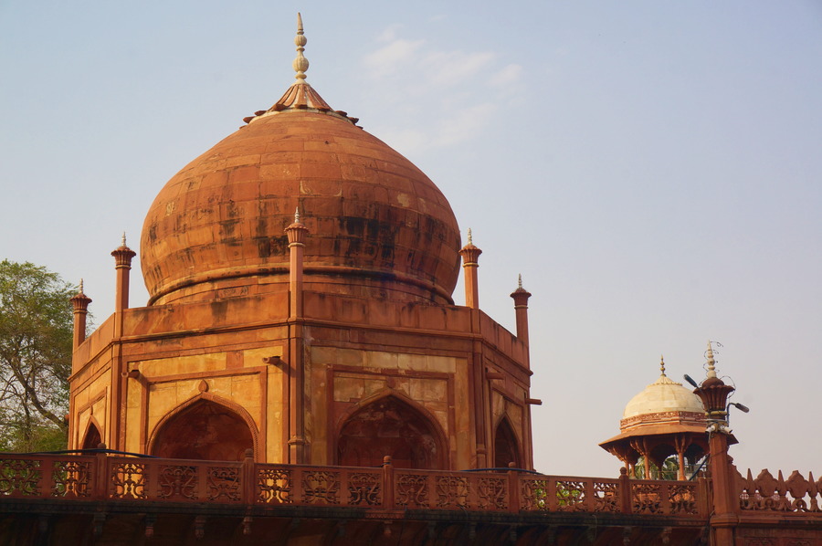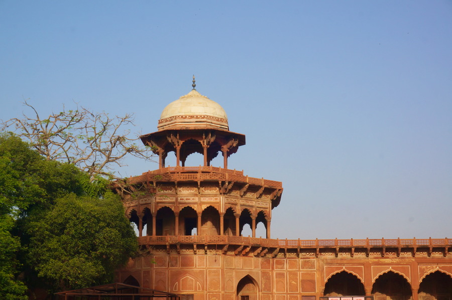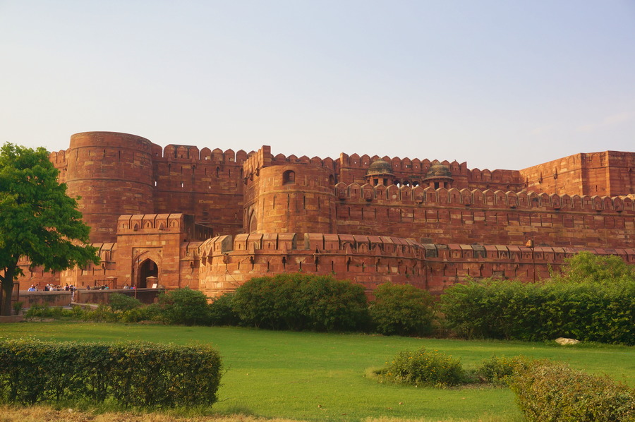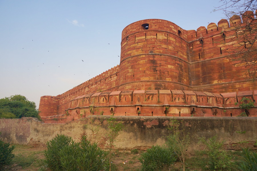 Avec ses 38 hectares, le fort rouge d’Agra est le plus grand fort d’Inde. Il a été achevé en 1573 sur les ruines d’un ancien fort en briques et est construit en grès rouge directement importé du Rajasthan voisin. Il servit à la fois de fort militaire et de palais résidentiel. Aujourd’hui encore, l’armée indienne occupe une partie de ses murs. Nous n’avons pas été visiter l’intérieur du fort car nous sommes arrivés sur le tard et notre budget visites n’est pas illimité. Mais nous en avons déjà pris plein les yeux juste en faisant le tour même si, une fois passé l’entrée joliment aménagée pour les touristes, nous retrouvons les travers typiquement indiens : montagnes de déchets, fils électriques qui pendent anarchiquement, urine sur les murs, etc. C’est dommage car le bâtiment est encore beau et il ne faudrait pas qu’ils subisse trop de dégradations.