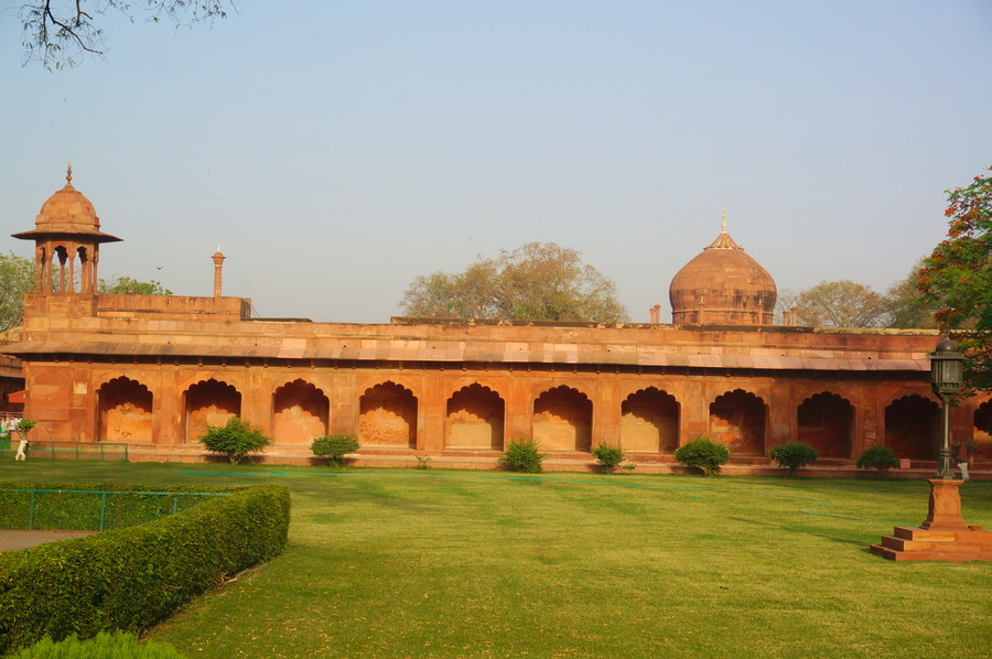 A gauche du mausolée, se trouve la mosquée. Elle est construite en grès rouge du Rajasthan son style architectural tend plus vers la tradition indienne mais on y retrouve des mosaïques de marbre blanc ainsi que quelques détails architecturaux piqués aux Persans.