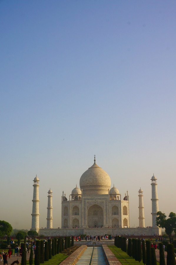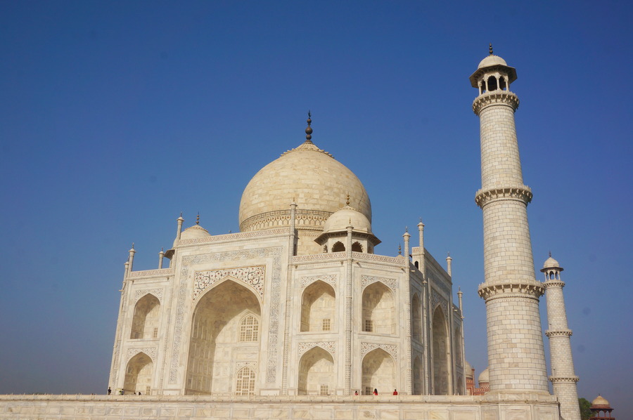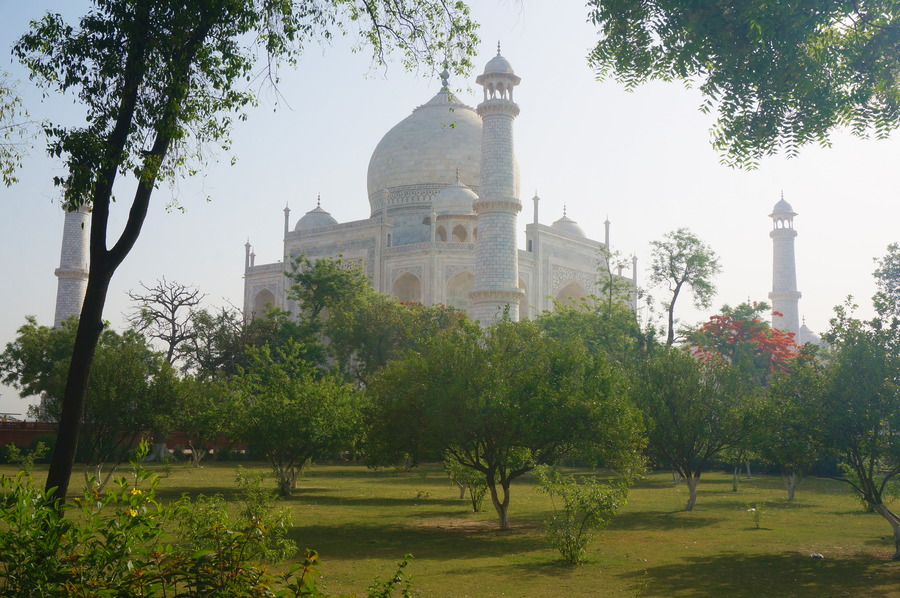 Construit entre 1631 et 1643, ce joyau de l’architecture moghole est composé uniquement de marbre blanc. Il est de forme octogonale, les huit côtés symbolisant les huit jardins du paradis. Il est entouré de quatre minarets, de marbre blanc également, donnant à l’ensemble une illusion de symétrie parfaite. Malgré la beauté du monument, nous sommes quand même frappé par sa taille modeste. Nous nous attendions à quelque-chose de plus grand.