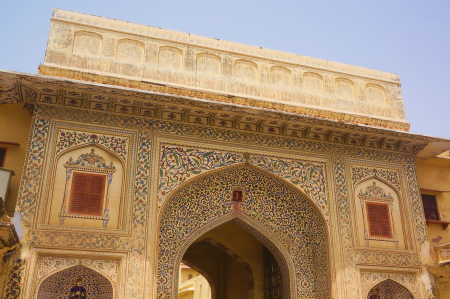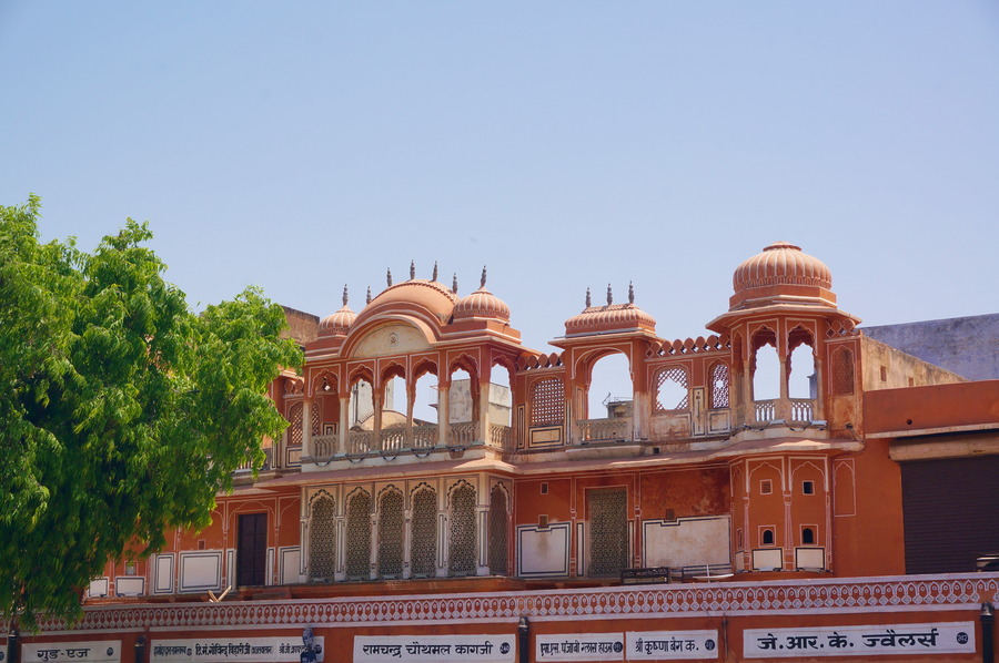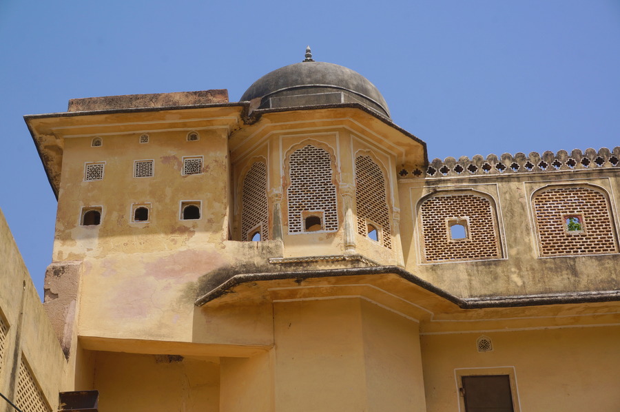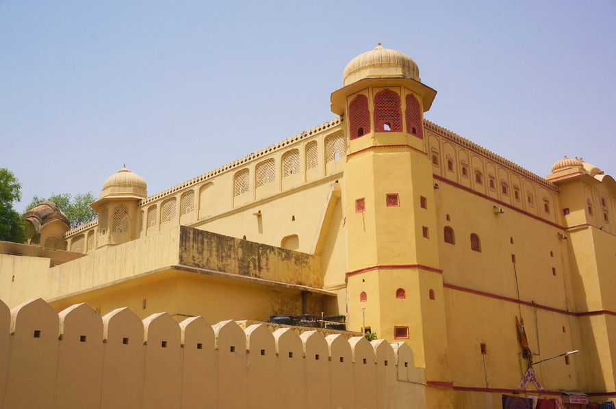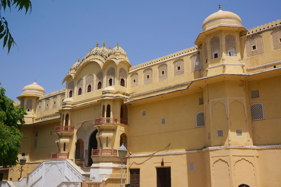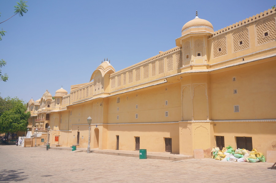 Côté pile, le palais arbore une architecture plus sobre et privilégie une couleur jaune, comme le City Palace voisin. Il donne sur une petite ruelle piétonne bien agréable, loin du trafic. Oui, à Jaipur, il y a un parc ET une rue piétonne! C’est tellement rare en Inde qu’il vaut la peine de le mentionner! Mais nous aurions préféré voir la façade principale donner sur la rue piétonne.