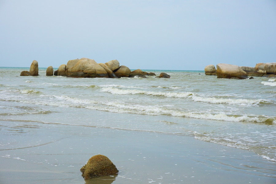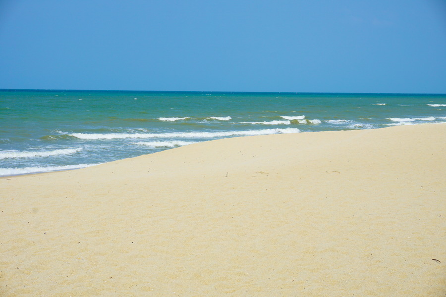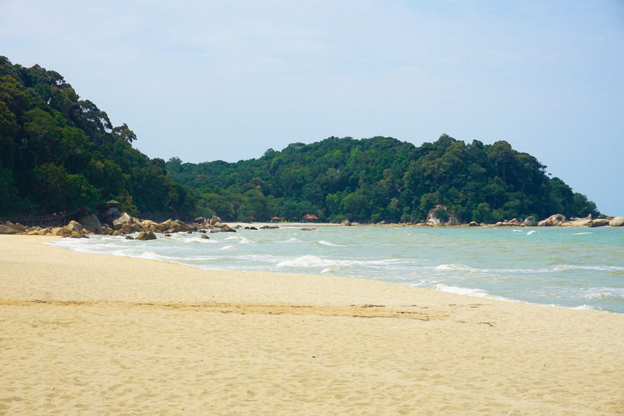 Mais si nous sommes venus jusqu’à la côte est, ce n’est pas pour rester dans une ville moche! Notre but, c’est de découvrir la playa! Celle de Kuantan, appelée Teluk Cempedak, se mérite, elle est située à cinq kilomètres du centre-ville. Mais nous sommes en Malaisie, un pays relativement bien organisé en transport publics, et il y a un bus urbain qui nous y emmène pour quelques ringgits. Nous ne sommes pas du tout déçus d’avoir fait le déplacement! Le sable blanc, l’eau turquoise, la végétation luxuriante, tout y est! Il y a juste de forts courants mais ça amène une brise bienvenue sur la plage. Pour une plage urbaine, elle est particulièrement belle!