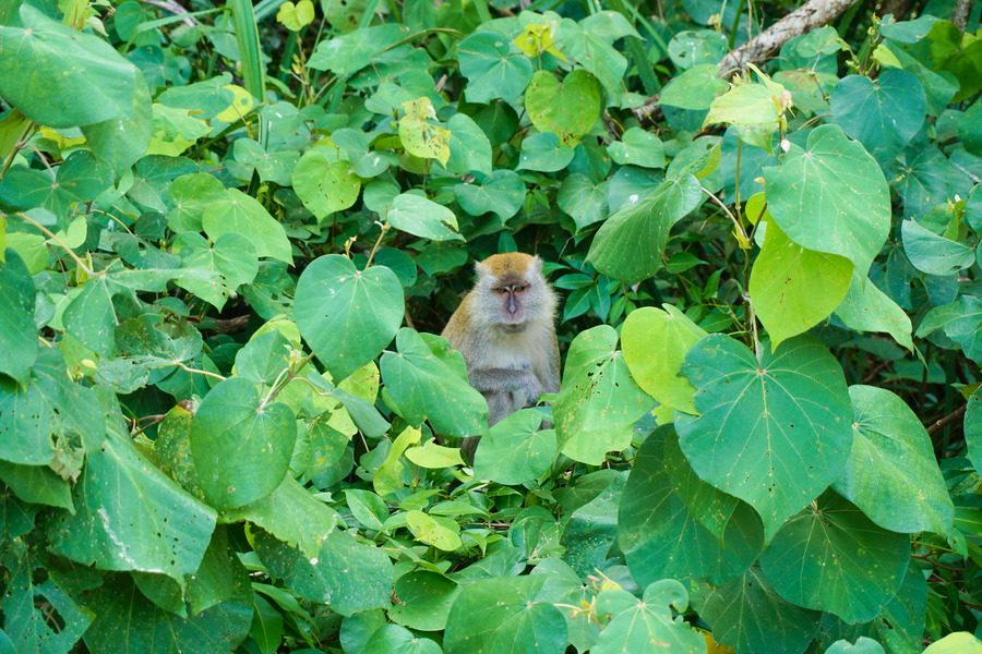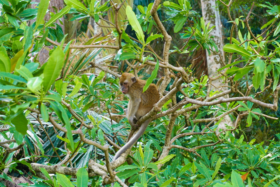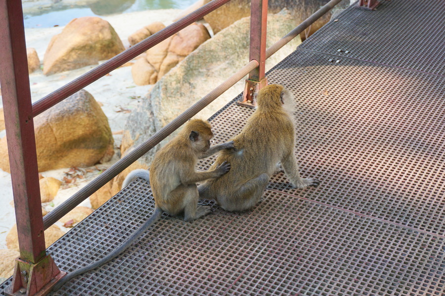A flanc de rocher, il y a une petite passerelle de quelques centaines de mètres qui longe la mer et qui nous attire fortement. Nous sommes tout de suite accueillis par une colonie de macaques pas du tout farouches qui essaient de savoir s’ils peuvent grappiller un peu de nourriture. Mais comme nous n’en avons pas, ils retournent vite vaquer à leurs occupations.