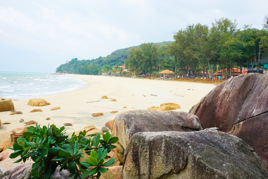 Mais si nous sommes venus jusqu’à la côte est, ce n’est pas pour rester dans une ville moche! Notre but, c’est de découvrir la playa! Celle de Kuantan, appelée Teluk Cempedak, se mérite, elle est située à cinq kilomètres du centre-ville. Mais nous sommes en Malaisie, un pays relativement bien organisé en transport publics, et il y a un bus urbain qui nous y emmène pour quelques ringgits. Nous ne sommes pas du tout déçus d’avoir fait le déplacement! Le sable blanc, l’eau turquoise, la végétation luxuriante, tout y est! Il y a juste de forts courants mais ça amène une brise bienvenue sur la plage. Pour une plage urbaine, elle est particulièrement belle!