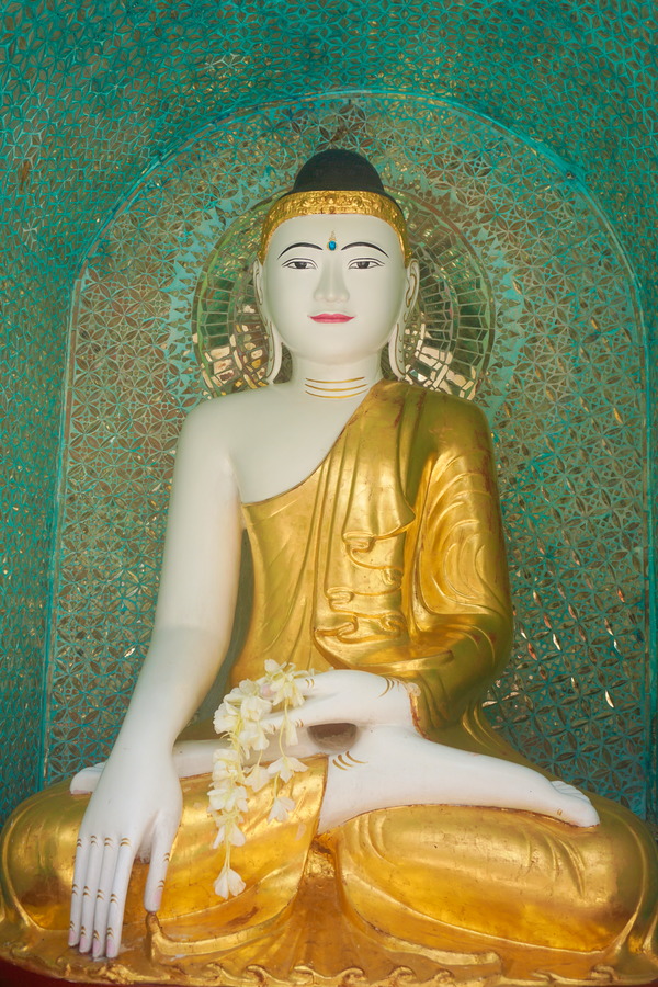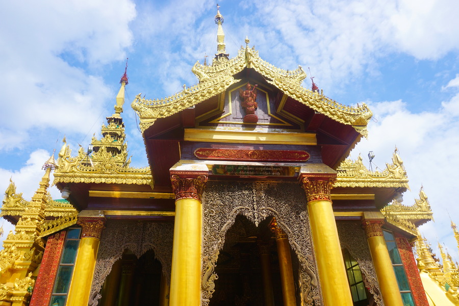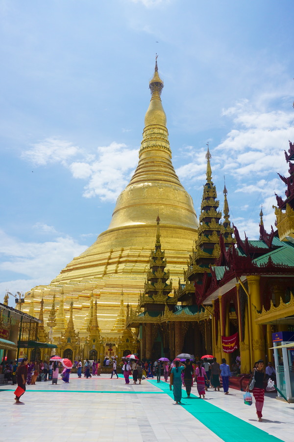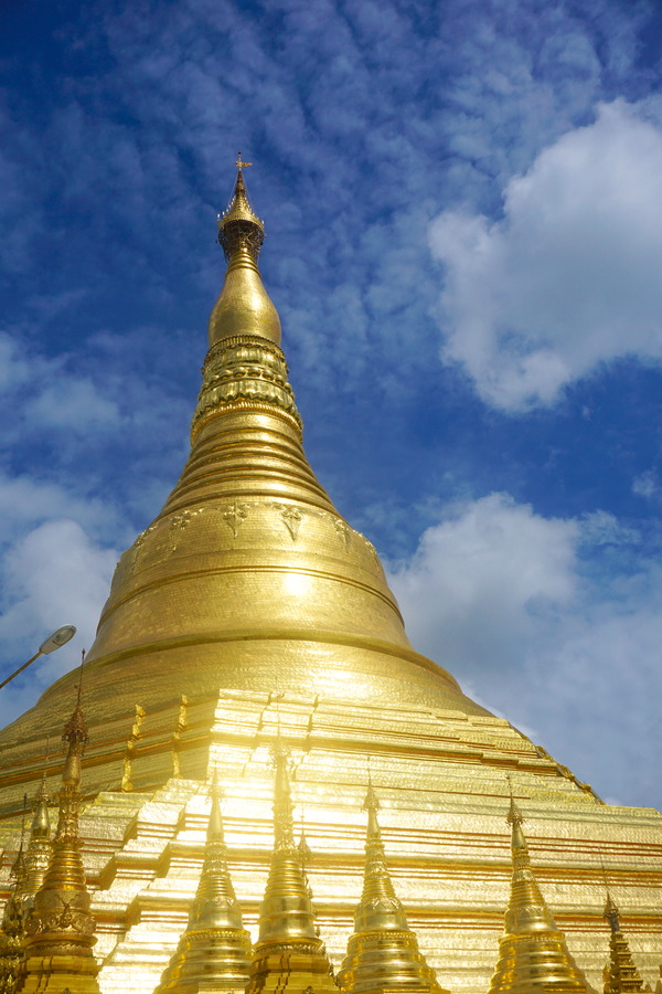 C’est un énorme stupa haut de 98 mètres recouvert de milliers de feuilles d’or importées directement de Mandalay. Il est entouré par 64 « petites » pagodes, également constituées de feuilles d’or. Sur la flèche ou se situe le hti (la petite ombrelle au sommet), sont accrochées plus de 1480 clochettes en or ou en argent qui tintent dès qu’il y a un peu de vent et la mélodie y provenant est vraiment très jolie.