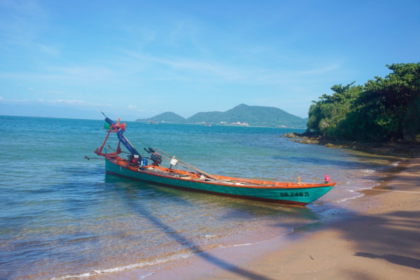 En anglais, cette petite île au large de Kep s’appelle Rabbit Island (L’île du lapin), un nom qui nous laisse perplexe car il n’y a pas l’ombre d’un lapin sur l’île et, après avoir retourné la carte dans tous les sens, nous ne trouvons aucune ressemblance entre la forme de l’île et cet animal à longues oreilles. Pour rejoindre ce coin de paradis, il y a deux solutions : soit on prend un billet dans une agence du coin pour huit dollars par personne avec des départs à heures fixes, soit on privatise un bateau pour vingt-cinq dollars. Nous avons choisi cette dernière option en partageant notre embarcation avec un couple français et un couple allemand. On fait fort dans l’amitié européenne là! Le trajet nous est donc revenu à un peu plus de quatre dollars par tête et nous avons pu choisir nos horaires.