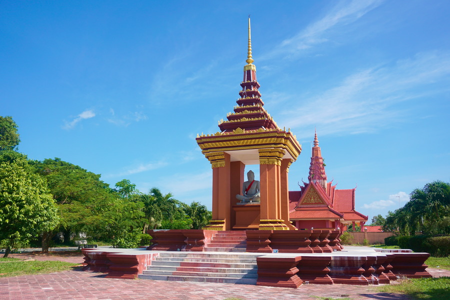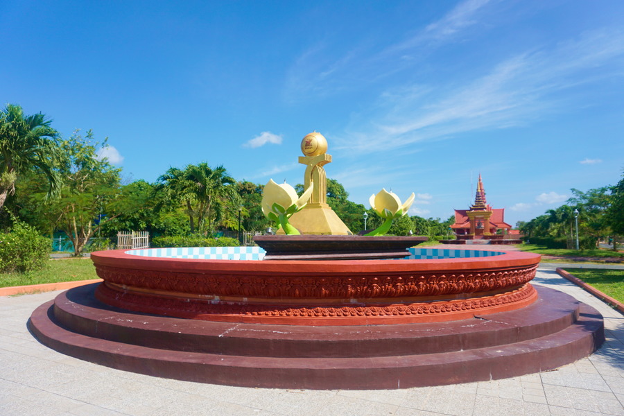 Kep reste une station balnéaire et est principalement composée d’hôtels et de restaurants. Mais il existe une allée ou se concentrent monuments et bâtiments administratifs mettant à l’honneur l’architecture khmère. Même si tout est moderne, l’architecture traditionnelle a été respectée. La fontaine représente l’ASEAN (Association of South East Asian Nations), une organisation économique et culturelle regroupant tous les pays d’Asie du Sud-Est, un peu comme le Mercosur en Amérique du Sud. Juste derrière la fontaine, la colonne est le monument en l’honneur de l’Amitié entre le Cambodge et le Vietnam. Pour rappel, en 1979, c’est l’armée vietnamienne qui est venue libérer les Cambodgiens de l’enfer des khmers rouges. Depuis, les deux pays gardent d’excellentes relations.
