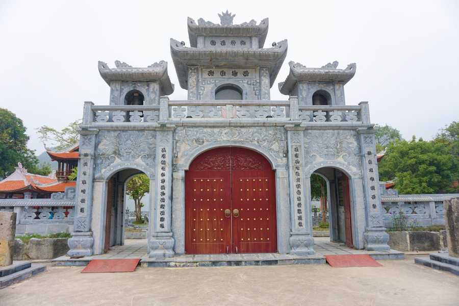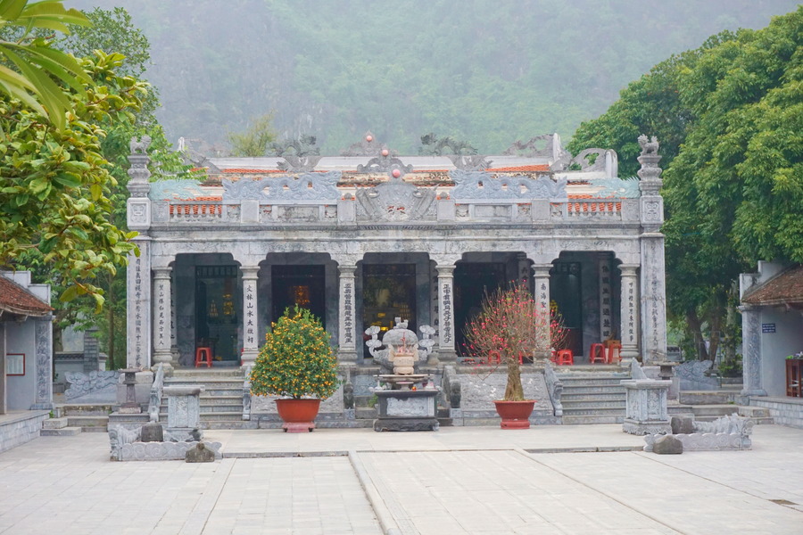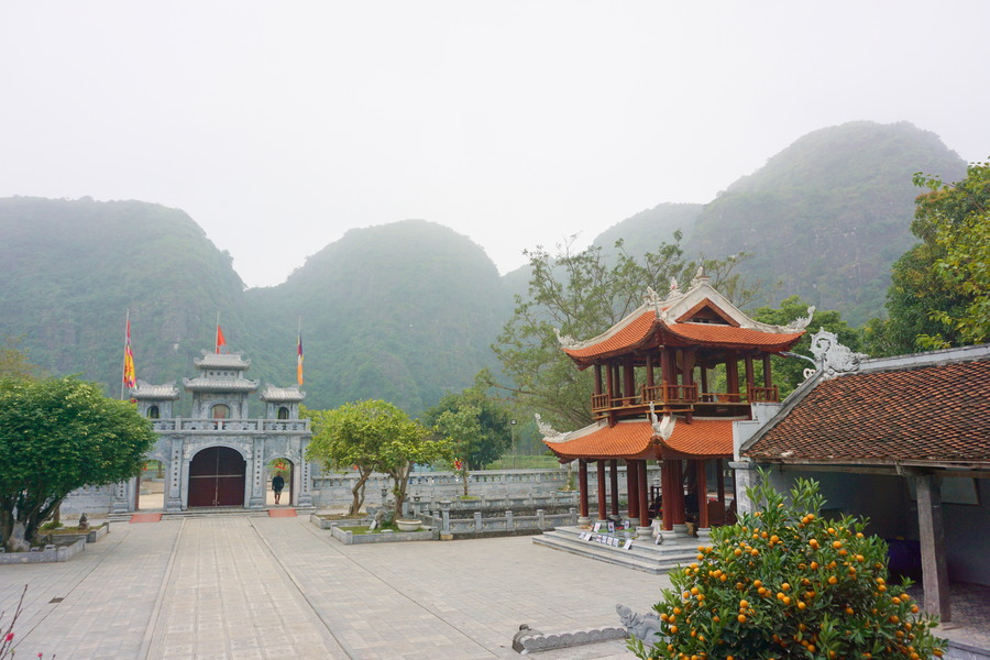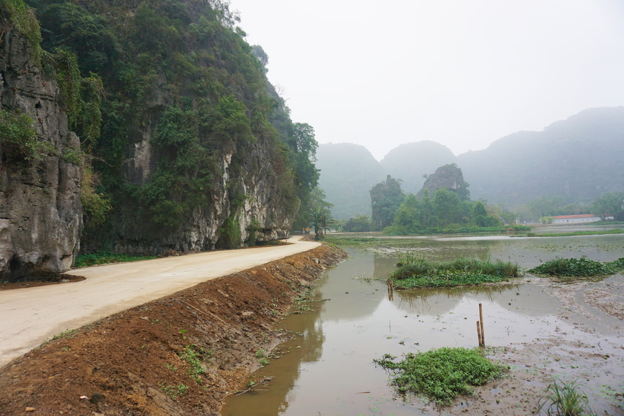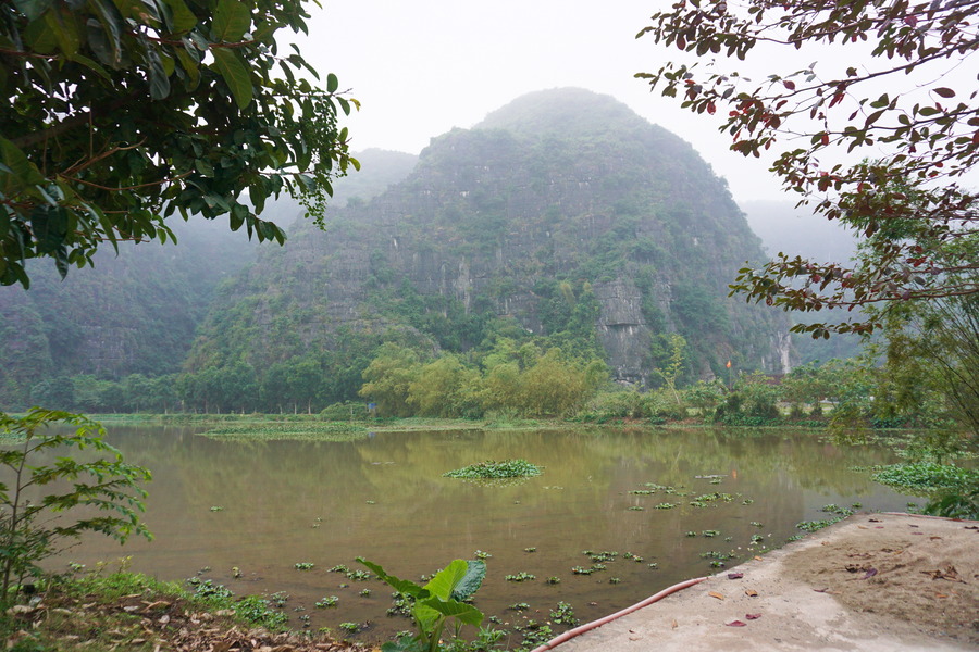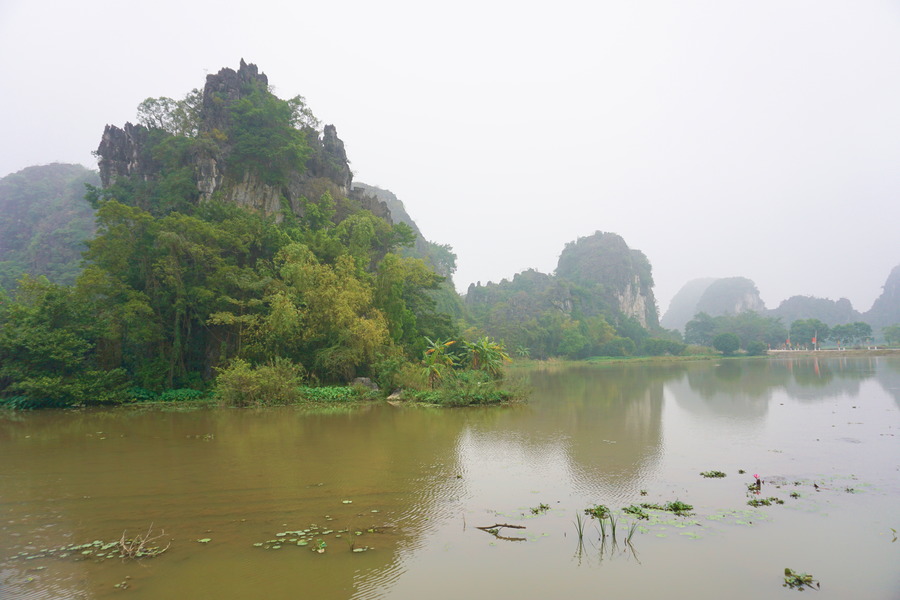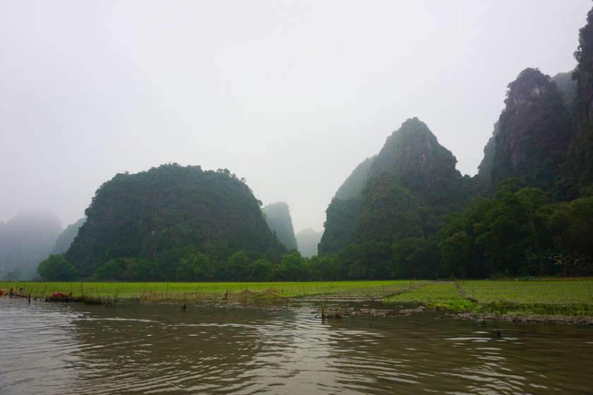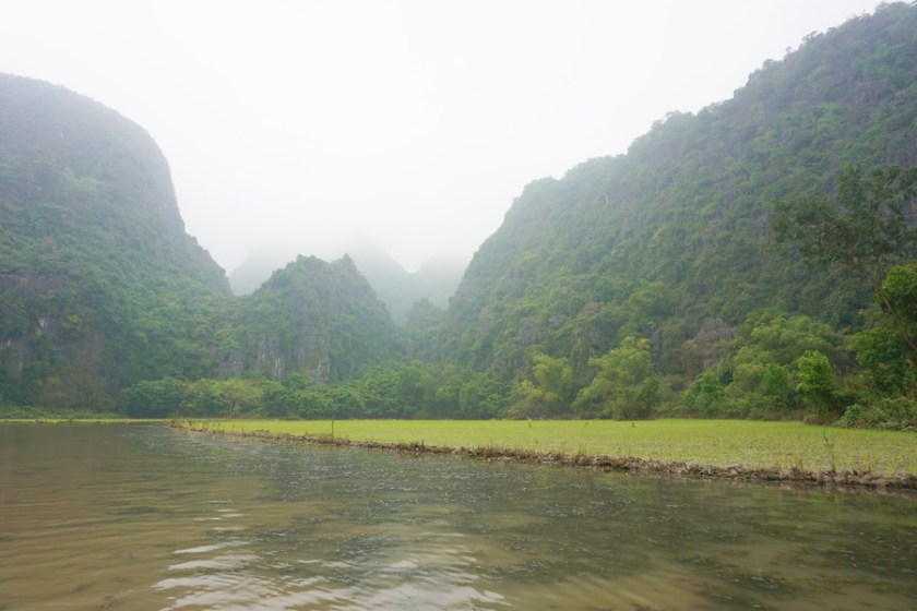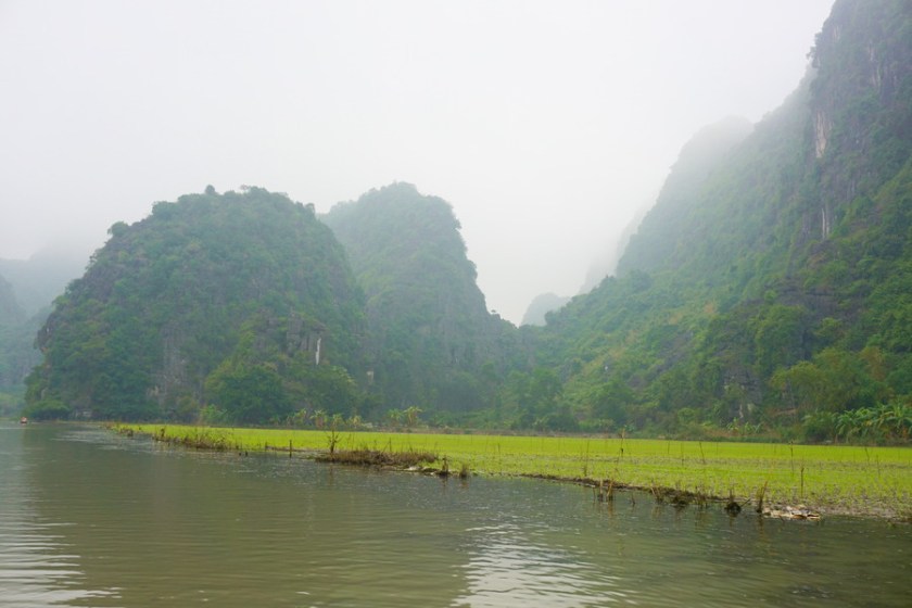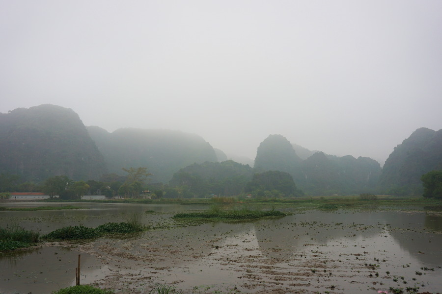 Ninh Binh n’a absolument rien d’intéressant mais c’est la porte d’entrée pour le site de Tam Coc, plus connu sous l’appellation de baie d’Halong terrestre. Ce surnom est dû a ses pics karstiques sortant comme des champignons de la terre. La météo se montrant capricieuse, nous devons composer avec la brume mais cette dernière donne au lieu un côté mystique et enchanteur qui nous fascine. Par contre, il fait assez frais en ce mois de janvier et une bonne veste est de rigueur, même pour Raymond et Angela, pourtant plus habitués au froid que nous.