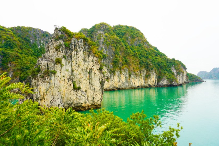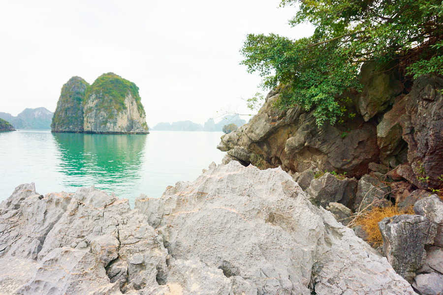 Nous mettons un pied à terre sur un de ces fameux pics karstiques afin d’aller visiter les grottes. Avec l’érosion, les roches karstiques regorgent de grottes et de cavernes naturelles. Nous avons justement grimpé sur un de ces rochers d’où nous avons pu observer une partie de la baie depuis en haut.