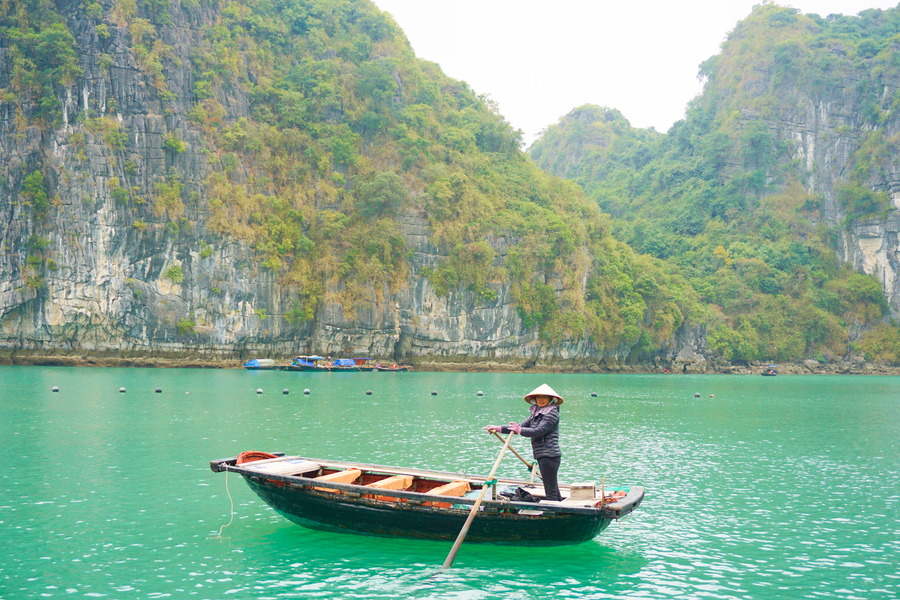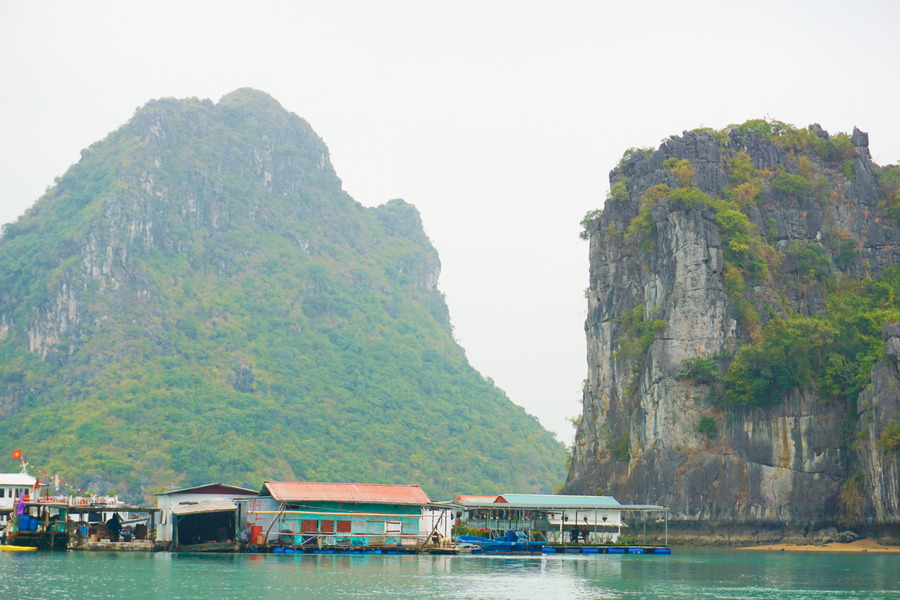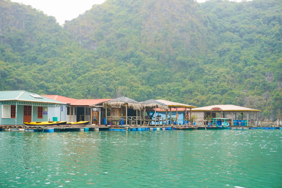 Une des particularités de la baie d’Halong, ce sont ses villages flottants parsemés dans divers endroits de la baie. La vie s’y organise autour de la pêche et de la culture des huitres perlières.