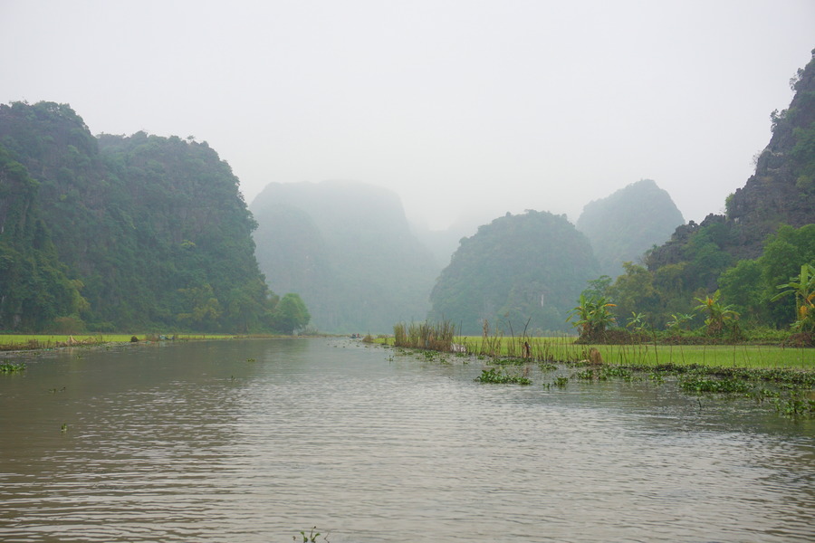 Ninh Binh n’a absolument rien d’intéressant mais c’est la porte d’entrée pour le site de Tam Coc, plus connu sous l’appellation de baie d’Halong terrestre. Ce surnom est dû a ses pics karstiques sortant comme des champignons de la terre. La météo se montrant capricieuse, nous devons composer avec la brume mais cette dernière donne au lieu un côté mystique et enchanteur qui nous fascine. Par contre, il fait assez frais en ce mois de janvier et une bonne veste est de rigueur, même pour Raymond et Angela, pourtant plus habitués au froid que nous.