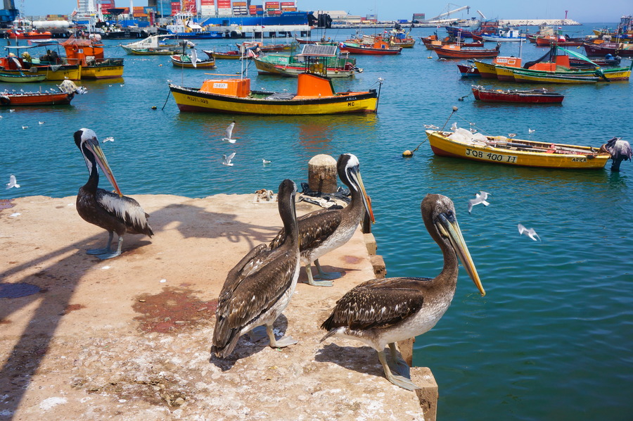 Quitter le pays! La seule option viable depuis Uyuni, c’est le Chili. Ce pays n’était pas sur notre liste pour cause de budget, qui avait déjà bien souffert en Argentine. Il nous a fallu prendre le bus à quatre heures du matin pour ensuite poireauter quatre heures à la douane chilienne! Heureusement que les barrages routiers ne concernaient pas cette partie du pays! Malgré ces petits tracas, traverser le paysage incroyable du désert d’Atacama nous a laissés sans voix. Arica n’est pas une ville exceptionnelle mais il y fait chaud, il y a du soleil et elle possède une superbe plage sur l’océan Pacifique. Le port vaut le détour pour y déguster un ceviche acheté au marché local en compagnie des pélicans et des otaries.