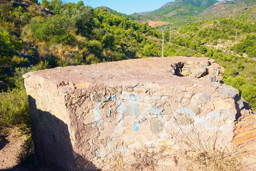 Mais nous n’avons pas fait l’effort de grimper à travers le maquis pour rien! Notre but était de voir les vestiges de cette forteresse qui ne date ni de la période arabe ni du Moyen-Age mais… de 1938! C’est une ligne de défense construite par les Républicains pour défendre la région des assauts des nationalistes pendant la Guerre Civile Espagnole. Et ça a en partie fonctionné puisque la région a été la dernière à résister aux troupes du Général Franco. Pourtant, même pour l’époque, elle est de construction sommaire : pierre et ciment, un peu de béton pour les bunkers. Elle part des rives de la mer Méditerranée à Almenara (juste au sud de Vall d’Uixo) et traverse les provinces de Castellón et de Teruel avant de terminer à Santa Cruz de Moya dans la province de Cuenca (Castille-la-Manche). Le but étant de protéger la ville de Valence puisqu’elle était, par circonstance, devenue capitale d’Espagne. Après la guerre, Franco fit démanteler toutes les installations défensives ne laissant que les murs.