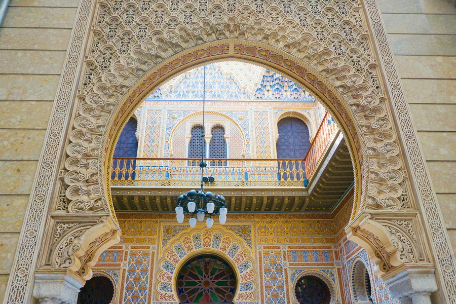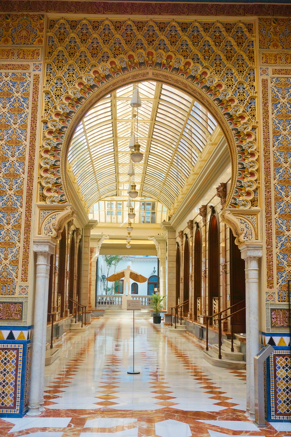 Le patio d’entrée nous emmène tout droit dans un conte des Mille et Une Nuits. Vous aurez reconnu l’architecture islamique. C’est de l’art appelé néonazari (attention ne lisez pas ce mot trop vite pour ne pas faire un amalgame avec un courant de pensée d’extrême droite!) ou tout simplement « art de Grenade« . Ces termes désignent la dernière époque de l’art hispano-musulman en Espagne.