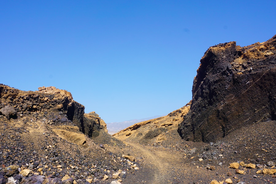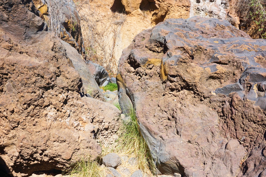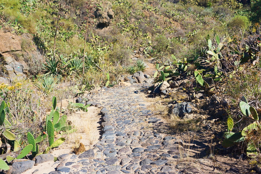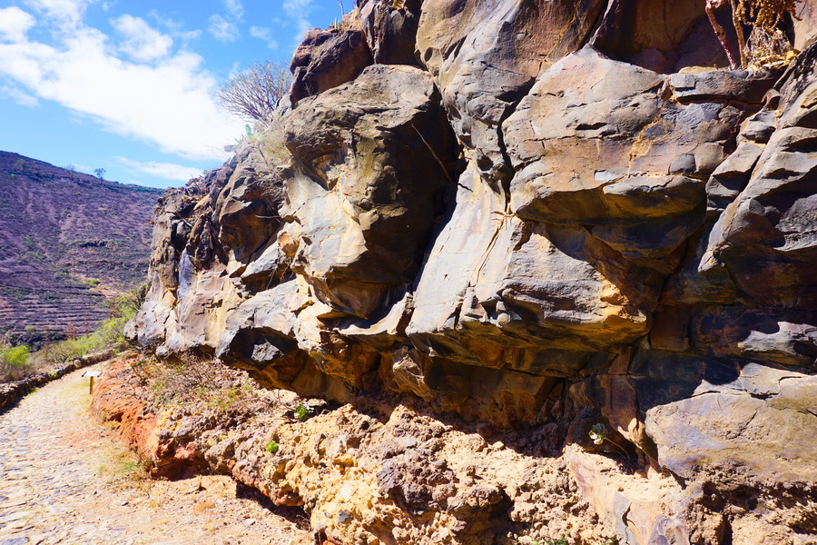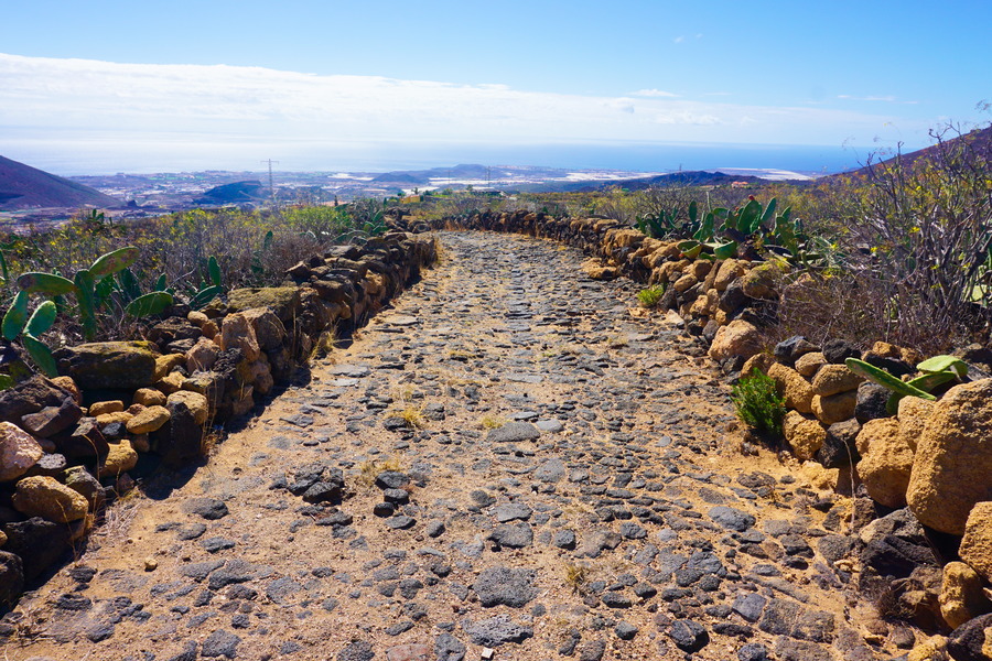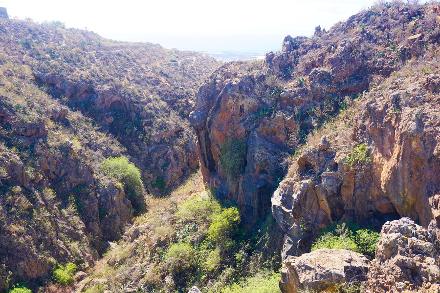 S’il y a un chemin dans le coin ce n’est pas pour faire plaisir aux randonneurs (mais ça nous fait plaisir quand même!) mais parce qu’il fallait arroser les cultures de la plaine côtière. Le sud de Tenerife est presque aride (nos bronches le confirment!), il faut donc amener de l’eau depuis les versants nord, plus humides. On y mit en place des systèmes d’irrigation exactement comme nos bisses valaisans ou on y construisit des puits bien profonds pour aller pomper de l’eau dans la roche. Aujourd’hui, il n’en reste que très peu de vestiges et certains « bisses » ont malheureusement été remplacés par des tuyaux en plastique.
