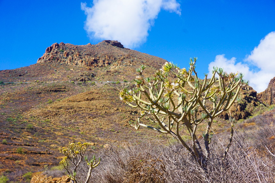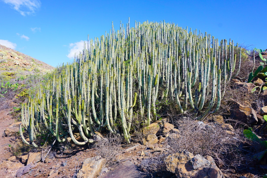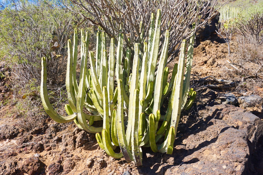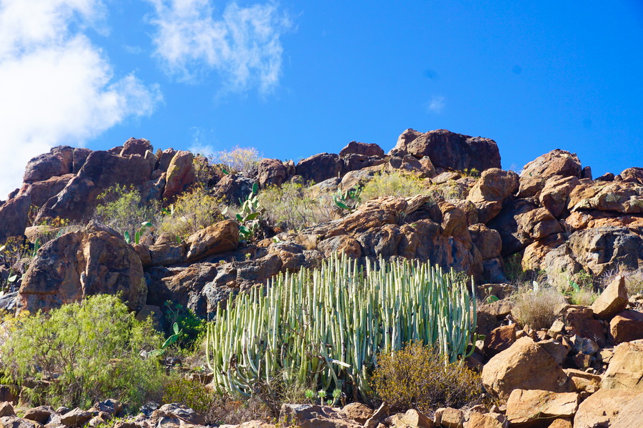 En général, nous préférons les randonnées en montée mais nous sommes tributaires des bus et, au vu des horaires, il était plus judicieux de monter en guagua (le petit nom des bus aux Canaries) et de redescendre à pied. Nous suivons le « chemin royal du sud » un ancien chemin muletier au milieu des roches noires d’origine volcanique et d’une végétation endémique. C’est un environnement totalement nouveau pour nous. Malgré notre tour du monde, nous n’avions encore jamais vu quelque-chose de ressemblant à Tenerife.