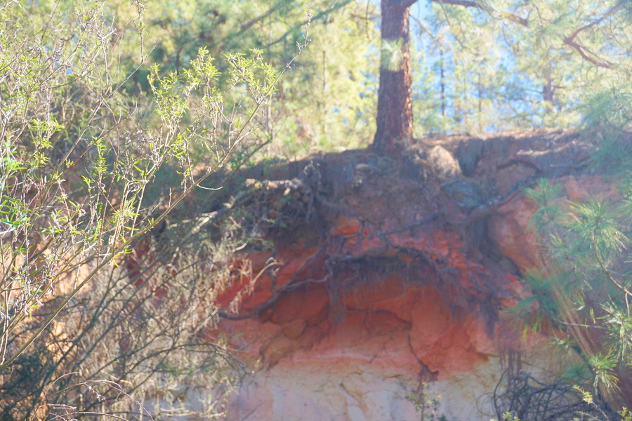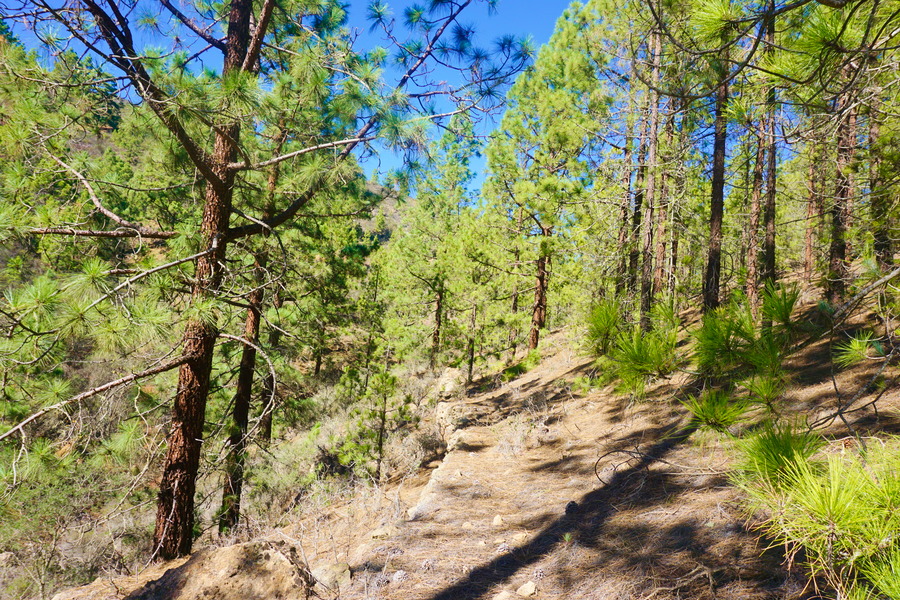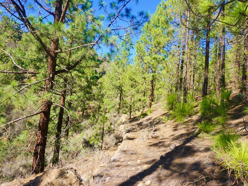 Une fois au sommet et avec le ventre plein, il va bien falloir penser à redescendre! Comme nous n’aimons pas emprunter le même chemin au retour qu’à aller, nous empruntons le versant est puisque nous sommes montés du côté ouest. Il y a toujours la forêt de pin des Canaries mais le côté « colorada » est moins marqué. Par contre, le relief est plus accidenté et nous devons longer quelques barrancos.