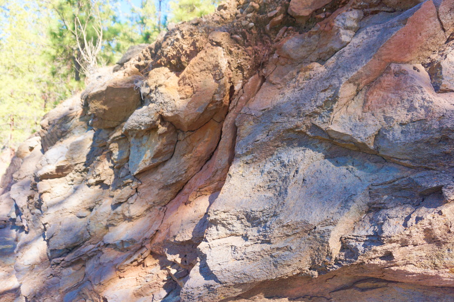 Même si vous n’êtes pas titulaire d’un master en langue espagnole, vous devez sûrement vous douter que Montaña Colorada signifie en français « Montagne Colorée ». Et vous avez raison! Sauf que ça ne se voit pas au premier abord. Oui, l’environnement est plus vert qu’ailleurs dans la région grâce aux pins des Canaries mais ce ne sont pas eux qui lui ont donné ce nom. Ce sont les roches. C’est vrai qu’en regardant de plus près, nous pouvons apercevoir divers types de roches allant du blanc au violet foncé en passant par du gris, du jaune et du rouge. Ceci est dû aux diverses éruptions qui ont eu lieu sur environ cinq millions d’années, à différentes périodes géologiques. Nous ne nous connaissons pas grand chose en la matière mais nous nous doutons fortement qu’ici, c’est le paradis des géologues et de tout autre amoureux des pierres.
