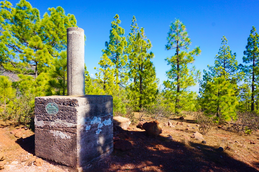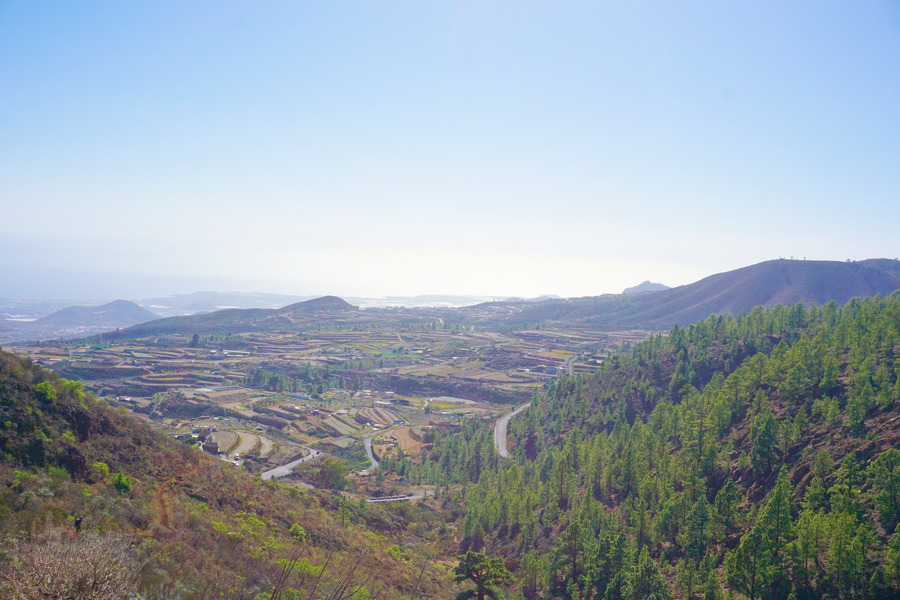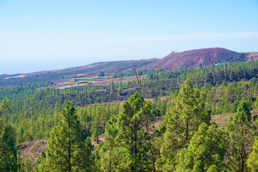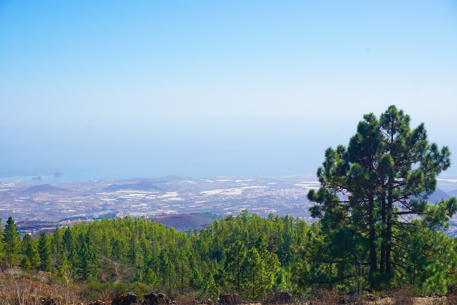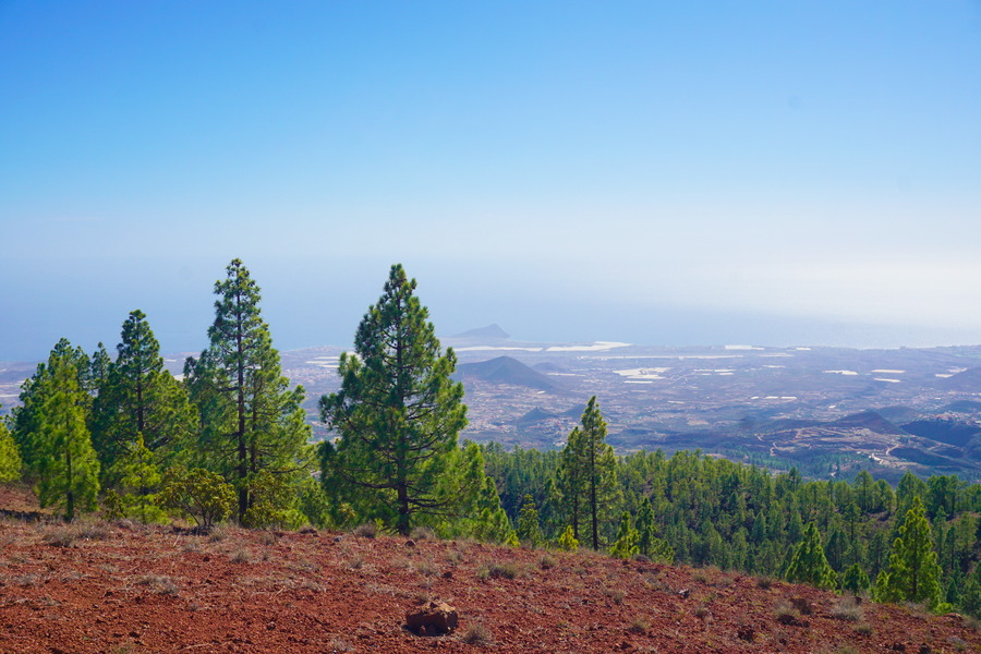 Depuis le sommet, nous avons une superbe vue à 360 degrés sur la Montaña Arena, Vilaflor de Chasna et le littoral du sud de l’île avec l’océan Atlantique. Ces jours, nous avons un petit vent de sud-est qui vient du continent et qui nous apporte de la chaleur et du beau temps mais aussi un peu de sable du Sahara qui reste en suspension dans l’atmosphère d’où l’aspect un peu brumeux du paysage côté mer. Ce phénomène météorologique a un nom bien particulier aux Canaries : la calima.