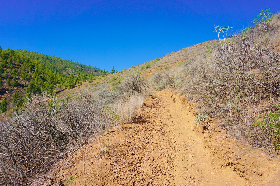 - Difficulté : moyen, c’est de la caillasse comme souvent à Tenerife. La première descente depuis le sommet de la Montaña Colorada est vraiment raide mais ne dure qu’une petite centaine de mètres. Une partie du chemin est masquée par un tapis d’aiguilles de pin, il faut juste être prudent à proximité des barrancos.