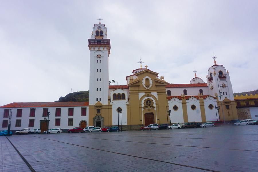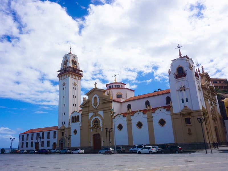 Voilà pourquoi nous avons bravé le vent, le froid et la pluie! Candelaria signifie en français « Chandeleur ». Oui, celle que nous fêtons dans les pays francophones le 2 février en mangeant des crêpes! Et nous l’avons d’ailleurs fêtée dignement cette année, on ne dit jamais non aux crêpes! Mais aux Canaries, c’est beaucoup plus important que quelques galettes puisque la « Virgen de la Candelaria » (Vierge de la Chandeleur ») est la patronne de tout l’archipel! Rien que ça! La grande place sur laquelle se trouve la basilique s’appelle d’ailleurs la « Place de la Patronne des Canaries » et a été conçue pour accueillir une foule de pèlerins lors de la procession de la Chandeleur. (hors Covid bien sûr!) La basilique actuelle ne date que de 1959. Nous avons été très surpris par la date de construction assez récente car son style architectural nous a bien fait penser aux églises Renaissance espagnoles que nous avons vues en Amérique du Sud et qui datent, pour la plupart, du XVe ou XVIe siècle. Cette énorme place, cette église néoclassique ainsi que le temps plutôt à la pluie nous a rappelé Quito que nous avons visité dans les mêmes conditions. Ici, il y a juste l’océan Atlantique en plus qui vient frapper la place de ses vagues déchaînées.