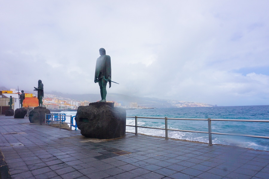 Difficile de le remarquer avec la marée haute, les grosses vagues et le temps tout gris mais la Candelaria possède une jolie plage de sable noir provenant de la roche volcanique et du Teide himself. La promenade qui longe l’océan est vraiment sympa et offre, quand il fait beau, une jolie vue sur la côte mais, lors de notre passage, le courant était tellement fort que nous nous sommes fait rincés par les vagues et l’eau était vraiment très froide! Les statues qui bordent la place de la Patronne des Canaries représentent les différents chefs guanches que connut Tenerife durant son histoire. Il y a également un petit port de pêche avec une confrérie locale de pêcheurs qui approvisionnent les restaurants locaux très prisés par les habitants de la capitale.