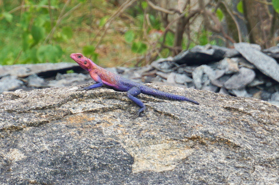 Avec les rochers réchauffés par le soleil, ça prolifère de lézards. C’est là que nous avons rencontré notre pote « Agama mwanzae » (Merci Google et Wikipédia!). Il s’appelle ainsi car c’est à Mwanza qu’il a été découvert même s’il a des représentants de son espèce également au Rwanda et au Kenya. Nous le trouvons très beau avec sa robe rose et violette. Oui, on parle de « lui » car c’est un mâle. La femelle est juste d’un brun quelconque.