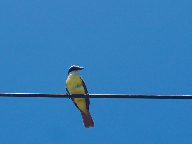 En parlant d’observation d’oiseaux, il y a un pitangus sulphuratus qui a plus ou moins consenti à poser pour notre objectif. Il est reconnaissable à sa tête brune et à son ventre jaune. C’est un oiseau assez courant dans toute l’Amérique latine mais il nous fascine quand même. Nous restons bouche bée devant toute la faune avicole, et toute la faune en général, de cette petite île.