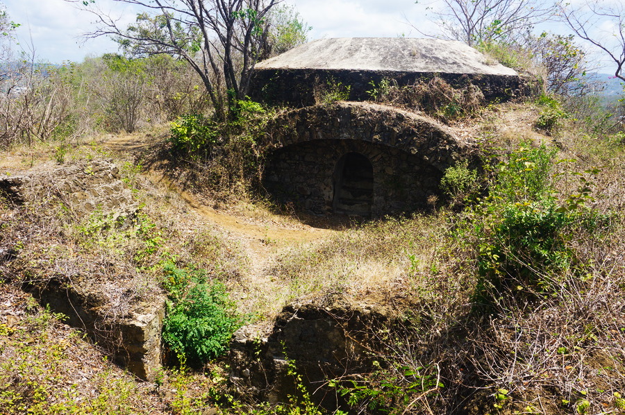 Nous avons profité de cette superbe baie pour effectuer notre traditionnelle petite grimpette. En fait, il y en a même deux : une pour voir le Christ-Roi et l’autre pour apercevoir les ruines d’une ancienne forteresse espagnole. Vu la chaleur, nous choisissons de n’en faire qu’une. Comme nous sommes plus attirés par l’histoire que par la religion, nous optons pour le fort. Le chemin commence à l’extrémité sud de la plage et grimpe sur un chemin en terre dans une végétation semi-aride. C’est impressionnant comme les courants du Pacifique sont secs et changent complètement le paysage. Au bord du lac Cocibolca, à moins de vingt kilomètres d’ici, le climat est vraiment humide et la végétation luxuriante. Nous n’avons pas trouvé beaucoup d’infos sur la forteresse. Nous savons juste que la ville a été fondée par les colons comme point d’accès au lac et qu’il y avait beaucoup de piraterie dans la région.
