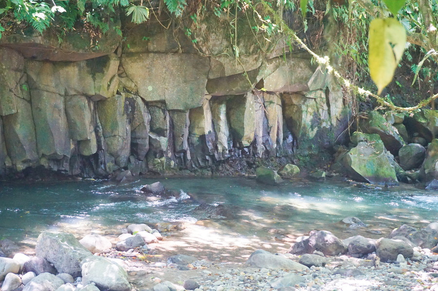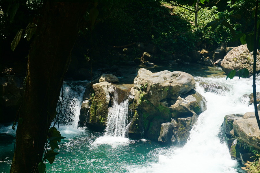 Afin de nous familiariser avec l’endroit et déjà découvrir un peu de forêt tropicale, nous nous rendons à El Salto à une quinzaine de minutes de marche du centre de La Fortuna. Nous pensions y trouver juste un plan d’eau avec une petite cascade. Que nenni! Il y a quand même une petite balade à faire dans la jungle en longeant le Rio Fortuna aux eaux cristallines. Ce n’est pas très long mais il y a quand même quelques endroits avec des cordes et des troncs d’arbres tombés à enjamber. La forêt est vraiment superbe, la végétation est luxuriante et les animaux que nous pouvons déjà observer sont juste waw! Le gros avantage de cet endroit, c’est qu’il est gratuit, chose très rare au Costa Rica!