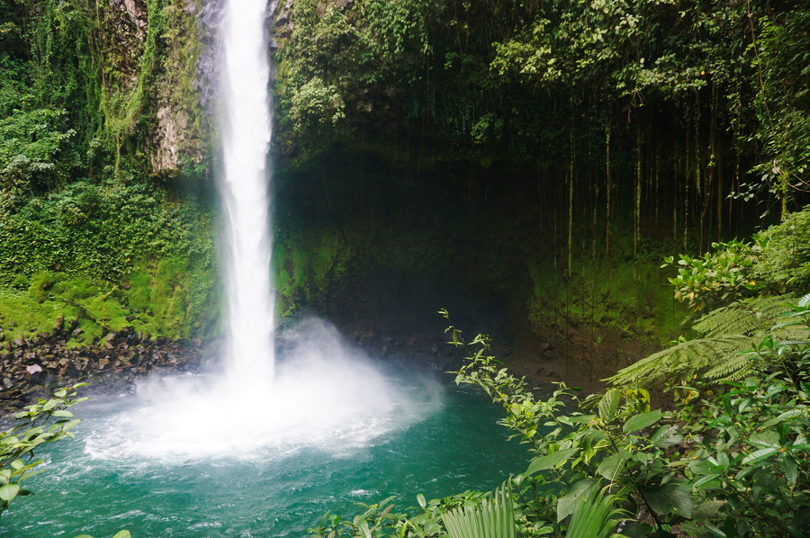 La cascade en elle-même est super impressionnante. Elle mesure 70 mètres de hauteur et a un énorme débit. Elle s’écoule depuis une paroi du cerro Chaco, un volcan, petit voisin de l’Arenal. On peut s’y baigner à son pied et c’est bien dommage. La plupart des touristes se croit plus dans une piscine municipale ou dans un parc aquatique que dans un espace naturel protégé et apeure la pauvre faune locale qui nage dans la rivière.