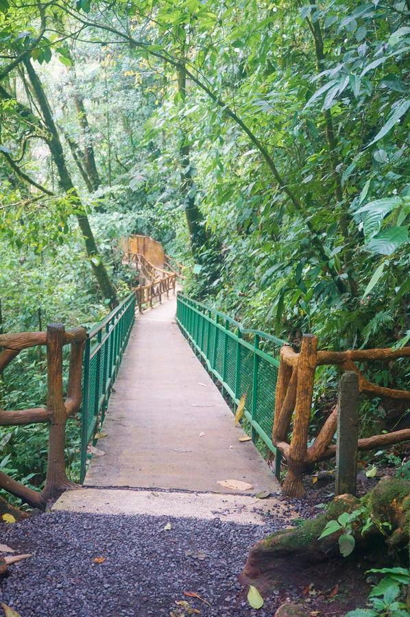 La Fortuna est le point de départ pour explorer le volcan Arenal est ses environs. Le bled en lui-même n’est pas ouf mais il y a de quoi dormir, se restaurer et même d’acheter des souvenirs made in China. Mais les alentours sont verdoyants, couverts par une dense forêt tropicale magnifique. Nous avons même aperçu des dizaines d’espèces d’oiseaux multicolores, tous plus beaux les uns que les autres, sans nous bouger les fesses de la terrasse de notre hostel! La Fortuna est connue pour se situer au pied du fameux volcan Arenal. Un cône triangulaire presque parfait culminant à 1720 mètres d’altitude. Avec ses 7000 petites années, c’est le volcan le plus jeune du pays. Nous avons eu de la chance de l’apercevoir! Le climat est très humide dans la région est le volcan est très souvent caché dans la brume!