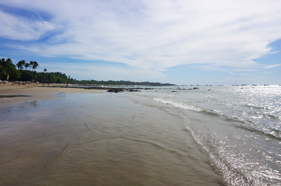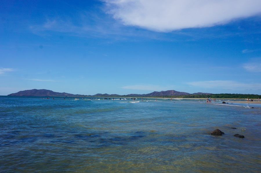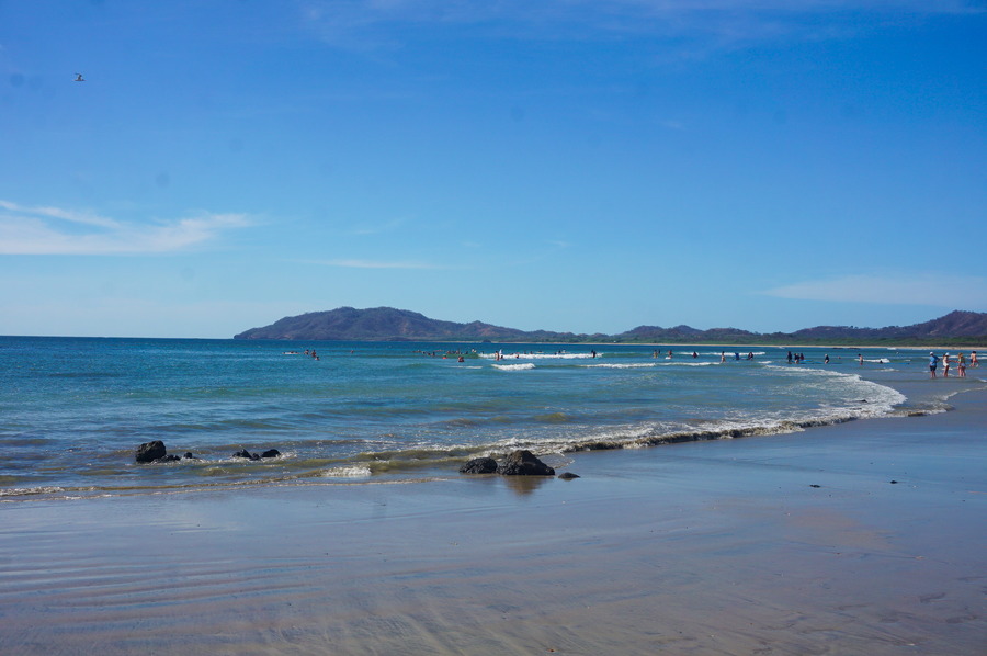 Notre lieu de villégiature est Tamarindo, sur la péninsule de Nicoya. Si vous regardez une carte, le Costa Rica a la forme d’un crabe qui regarde le Pacifique. La péninsule de Nicoya est une des pinces du crabe, celle située au nord, proche de la frontière d’avec le Nicaragua. La station balnéaire est souvent surnommée Tamagringo, nous nous attendions donc à un Cancún bis. Certes, ce n’est plus du tout le petit village de pêcheurs d’autrefois et il y a effectivement tout qui est dédié au tourisme, américain de surcroit, mais nous ne trouvons pas que ce soit si exagéré que ça. Il n’y a rien qui est construit en première ligne en bord de mer, à part quelques petits bars sympas en toit de chaume, et ça change tout! Nous avons d’ailleurs eu un véritable coup de cœur pour la plage restée un peu sauvage, sa végétation tropicale, ses marées, ses pierres volcaniques et ses mangroves! Et nous en avons vu des plages dans le monde!
