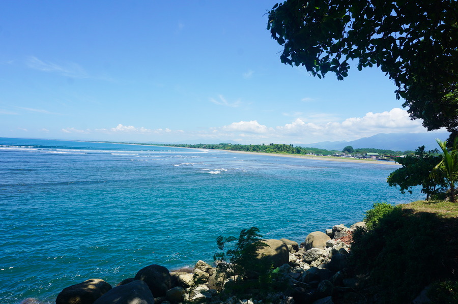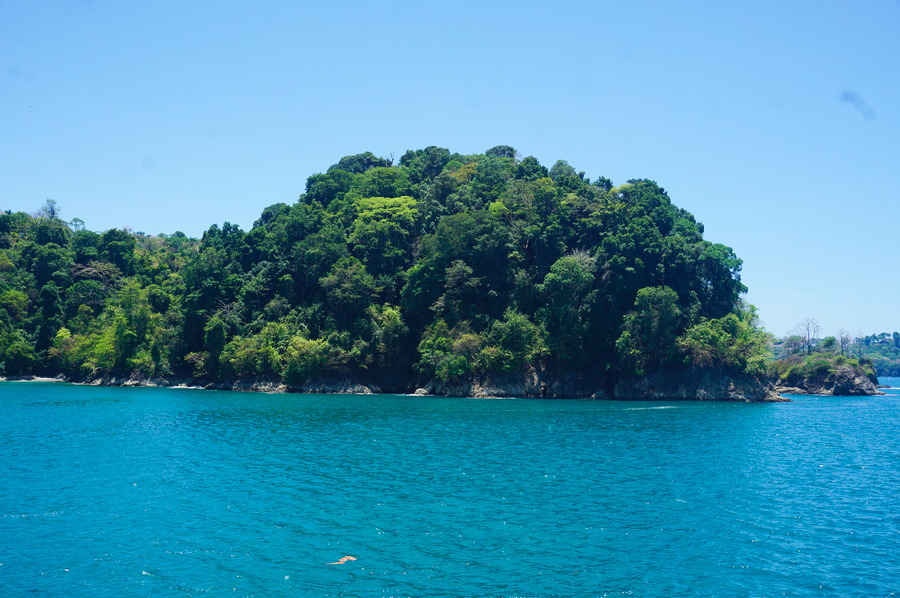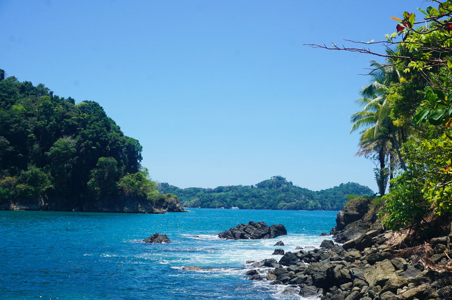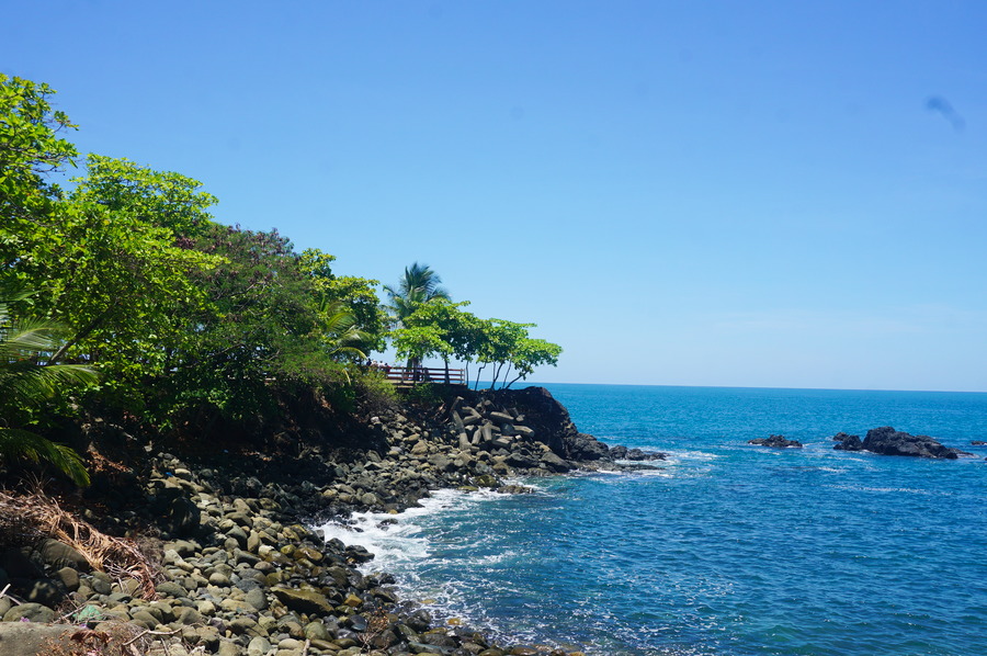 La plage de Quepos se trouve au nord de la ville et est séparée du continent par un petit bras de mer qu’il faut traverser en lancha. De loin, elle a vraiment l’air belle mais nous n’y sommes pas allés. Notre curiosité naturelle nous a plutôt mené vers le sud. Nous nous sommes retrouvés, après une marina très moche, au parc Nahomi. Le parc en lui-même n’a rien d’extraordinaire, c’est un parc municipal standard, il y a juste des bancs et une place de jeux. Mais il est situé sur un petit promontoire rocheux dominant l’océan d’où nous avons une superbe vue sur la forêt tropicale recouvrant quelques rochers karstiques se jetant dans la mer. Il y a un petit air de sud de la Thaïlande ici.