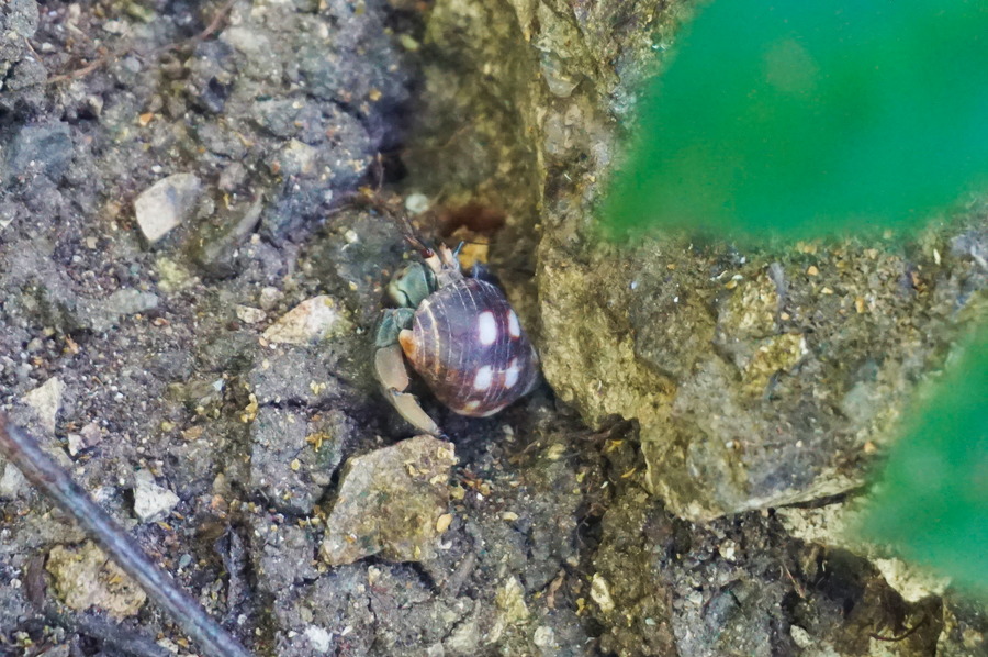 Ok, c’est vrai, nous n’étions pas totalement seuls au monde! Un petit Bernard-l’hermite un peu curieux est venu nous honorer de sa présence!