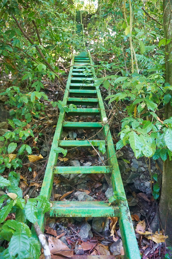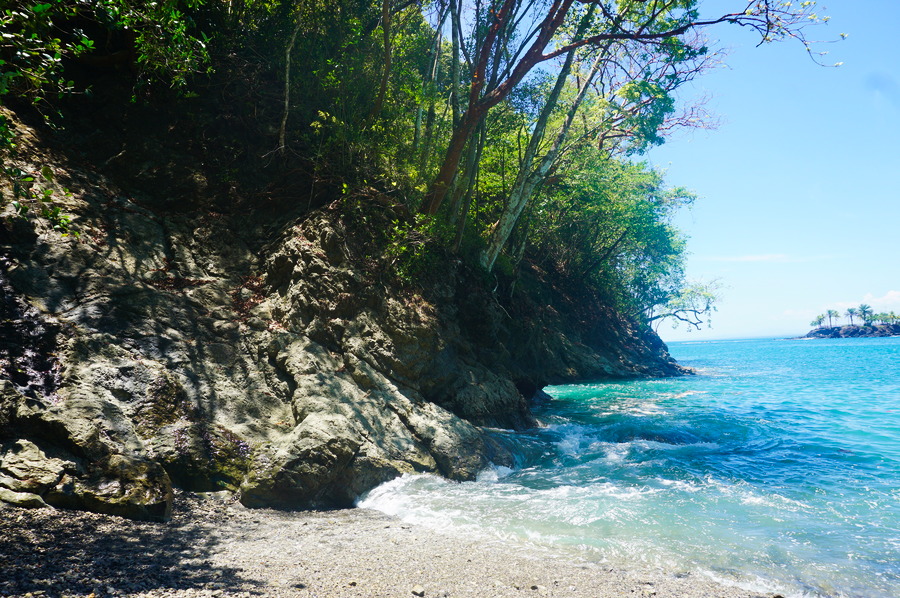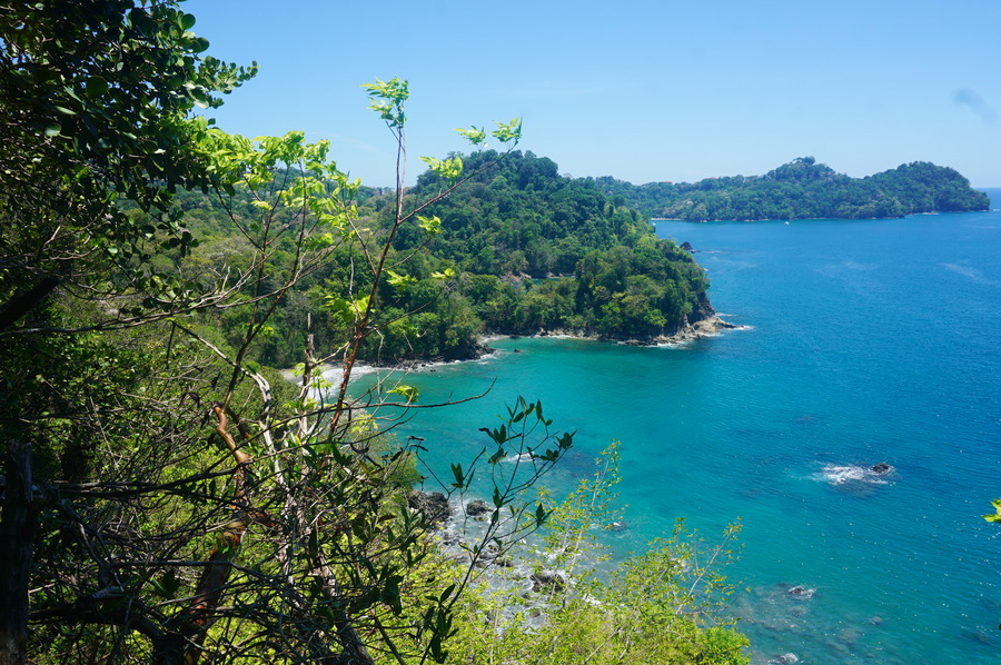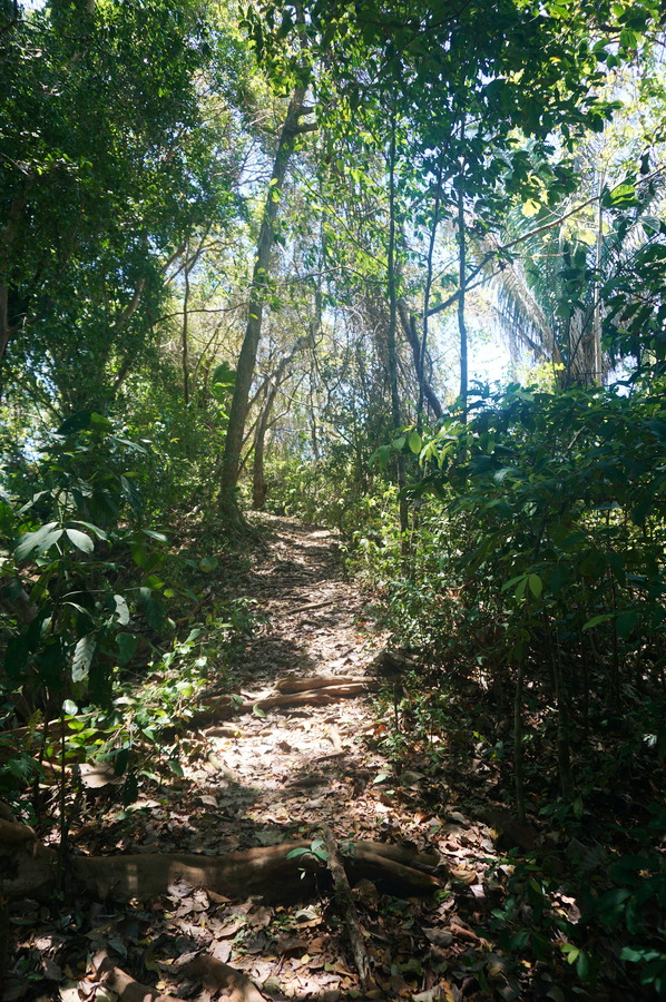 La montée est raide, le chemin un peu scabreux et parfois à pic, il fait une chaleur humide étouffante et il y a des singes qui nous narguent en nous montrant leurs fesses! Mais le jeu en vaut la chandelle avec cette vue incroyable sur l’océan et sur la côte découpée couverte de végétation tropicale. L’eau est tellement claire que nous pouvons apercevoir les cailloux dans la mer depuis en haut!