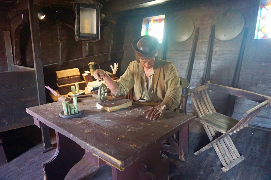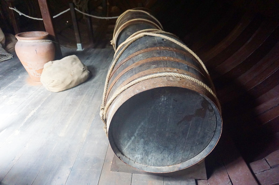 Visiter les cuisines nous a remis un peu de baume au cœur car on ne lésinait pas sur la bouffe à l’époque! Et encore moins sur le vin de Jerez dont les tonneaux prenaient les trois quarts de la place disponible! Bon l’eau n’était pas potable à l’époque, quitte à devoir boire du vin, autant que ce soit du bon! Heureusement que la Cruzcampo, la bière sévillane qui n’est objectivement pas très bonne mais dont il est interdit de dire à Séville qu’elle n’est pas bonne sous peine de se faire bannir de la ville, n’existait pas encore à l’époque sinon ils auraient dû en embarquer! Pas sûr qu’elle leur aurait permis de mener à bien l’expédition!