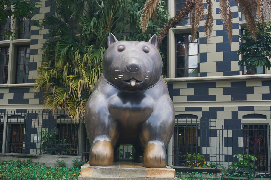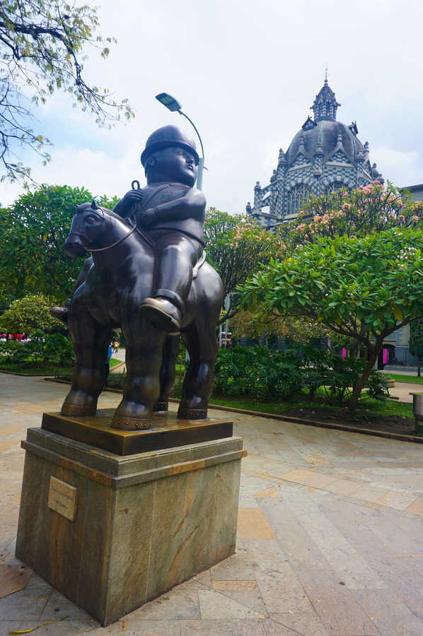 La rue Carabobo nous emmène sur cette énorme place ornée de sculptures un peu improbables. Ce sont les œuvres de l’enfant du pays Fernando Botero (1932-2023) qui était connu pour peindre ou sculpter des formes tout en volumes et en rondeurs. Le reste de ses travaux est exposé dans le musée d’Antioquia qui jouxte la place et que nous n’avons pas été visiter par manque d’envie. Un autre bâtiment d’envergure de la place est la casa de la cultura Rafael Uribe Uribe (Non, nous ne sommes pas bourrés, il y a bien deux fois le nom Uribe!). Ce monstre néogothique est l’œuvre de l’architecte belge Augustin Goovaerts à qui on doit également le Palacio Nacional cité plus haut. Il a toujours été dédié à la culture et à des exposition. Il porte le nom d’un militaire et diplomate colombien qui fonda l’université en Colombie.