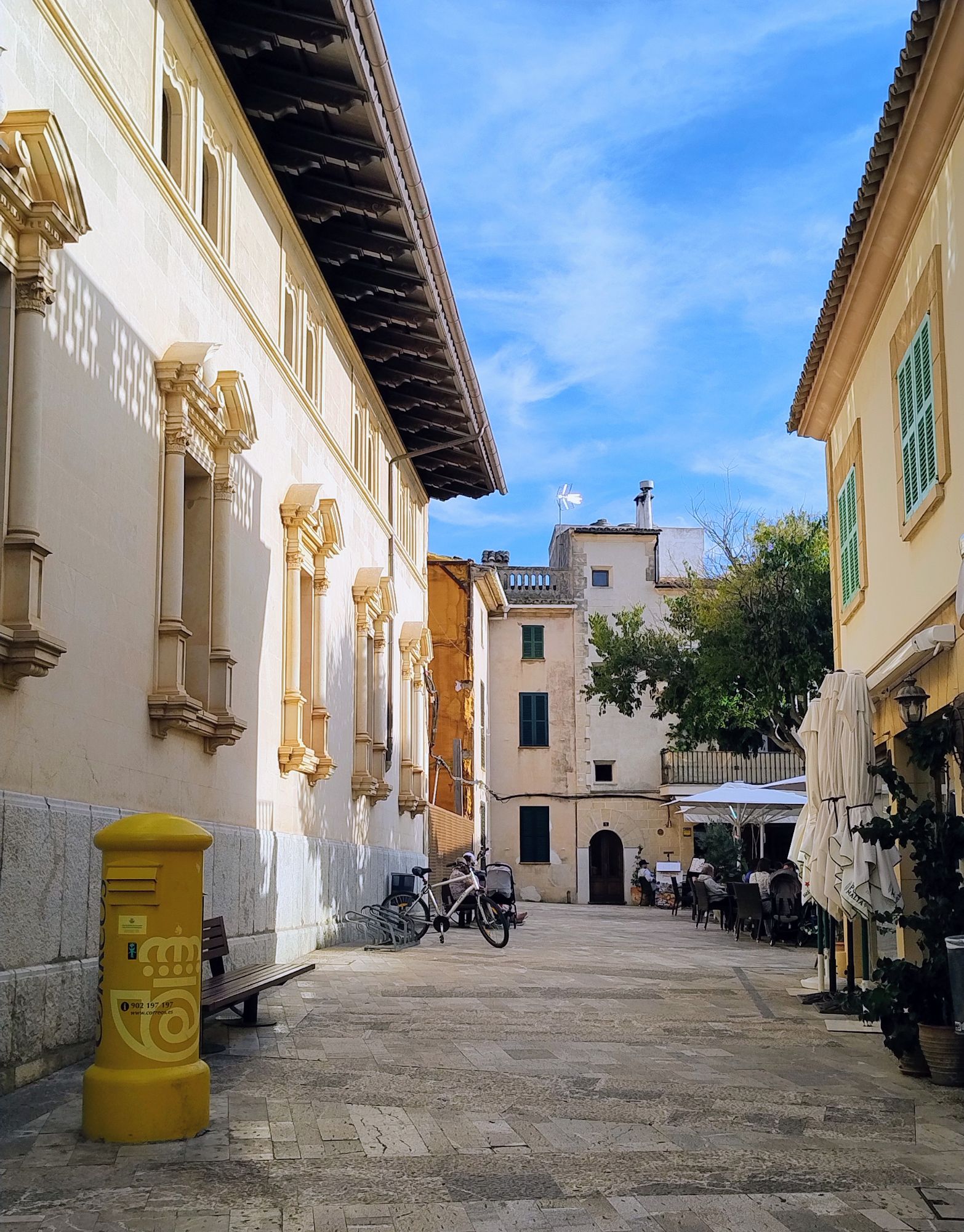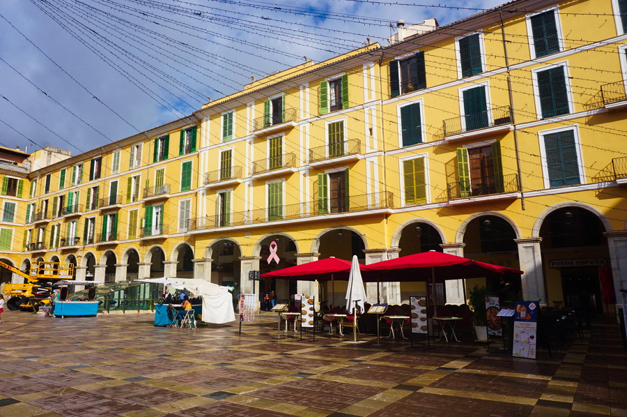 Comme (presque) toute ville espagnole qui se respecte, Palma possède sa Plaza Mayor bordée d’arcades. Elle n’est pas très grande (40 mètres sur 90 mètres environ) mais nous trouvons ses façades jaunes trop stylées. C’est une place assez récente (1838) puisque avant se trouvait un couvent ainsi que le siège de l’Inquisition. Nous ne savions pas que l’église catholique poursuivait encore les hérétiques jusqu’à une époque si tardive. Naïfs que nous sommes!
