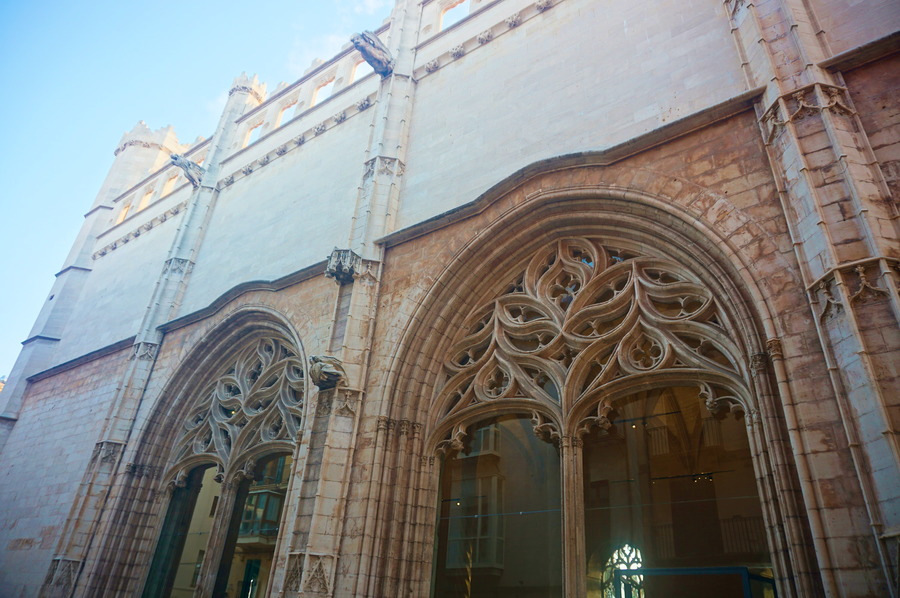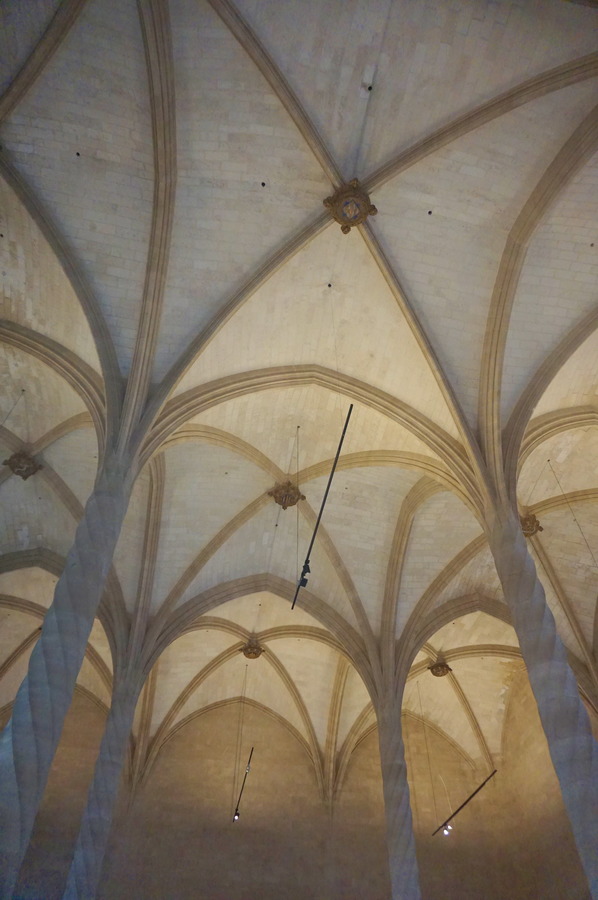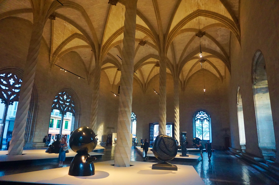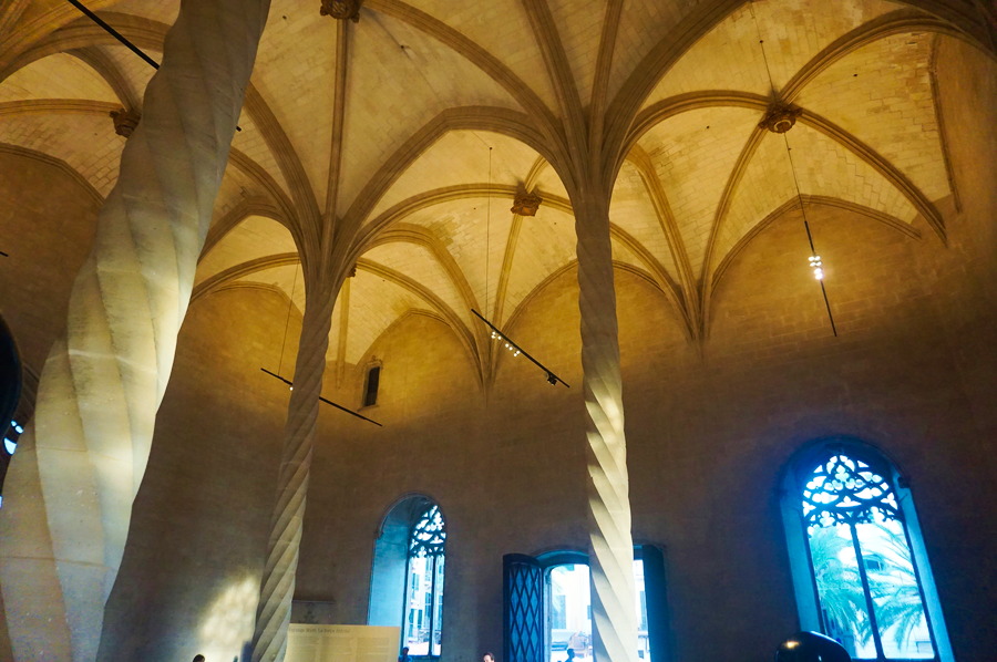 En continuant notre chemin depuis la cathédrale sur l’esplanade qui longe le bord de mer, nous tombons sur ce superbe bâtiment de style gothique, à nos yeux, encore plus beau que la cathédrale! C’est Sa Llotja ou la Lonja. C’était le lieu où les pêcheurs venaient vendre leurs prises du jour au gros. Elle date du XVe siècle et ressemble à comme deux gouttes d’eau à sa sœur valencienne, de la même époque. On peut pénétrer à l’intérieur pour admirer les impressionnantes colonnes qui soutiennent l’édifice. Lors de notre passage, il y avait une exposition de quelques œuvres de Joan Miró. Bien qu’il soit né à Barcelone, l’artiste à passé une bonne partie de sa vie à Majorque et, à Palma, on le considère un peu comme un enfant du pays. Il y a d’ailleurs une fondation Pilar et Joan Miró en ville que nous n’avons pas visitée par manque de temps.