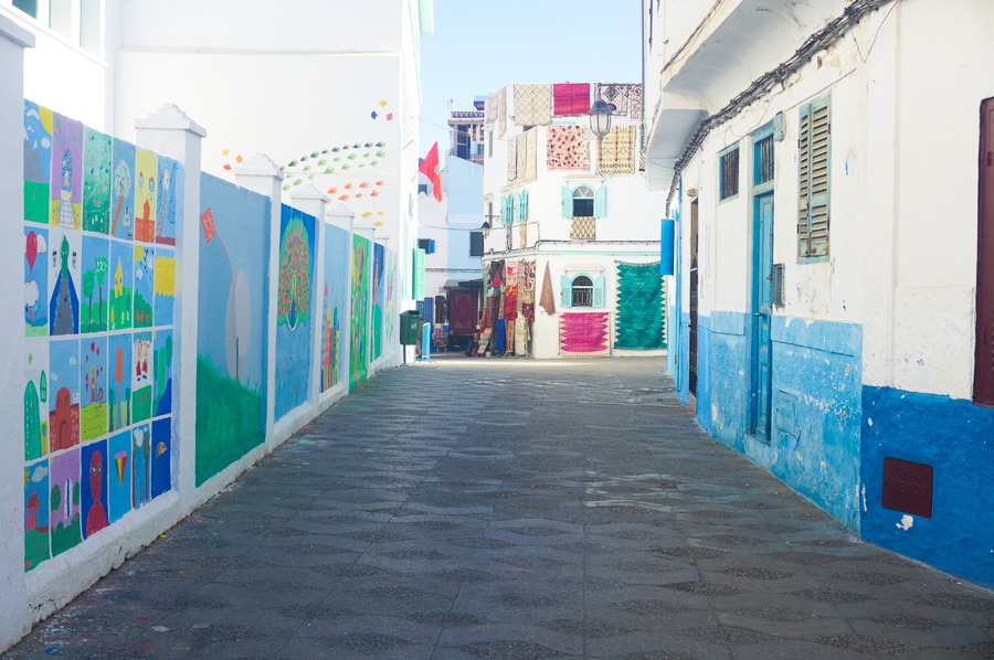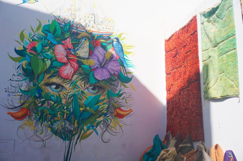 Nous ne le savions pas avant de venir, mais Assilah est la capitale artistique du Maroc. La médina regorge de galeries d’art et surtout, pour notre plus grand bonheur, de Street Art. Il est vrai que les façades blanches sont un support idéal pour ce genre d’exercice. Il y a même un festival de Street Art qui a lieu chaque année depuis 1978! Les peintures sont renouvelées assez régulièrement donc, on peut revenir plusieurs fois à Assilah et découvrir à chaque fois quelque chose de nouveau. Nous avons passé des heures à nous arrêter devant chaque œuvre d’art et nous les avons toutes adorées!