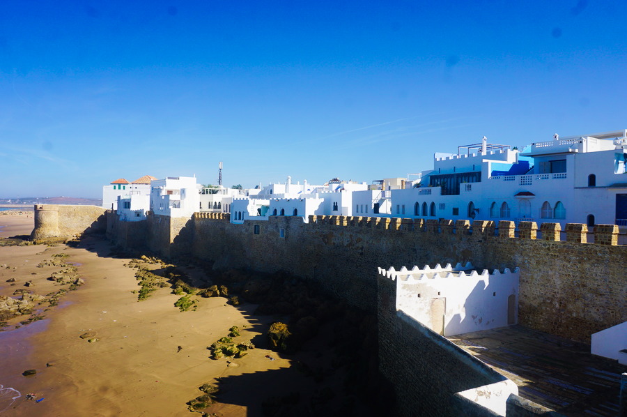 La ville d’Assilah se trouve à une quarantaine de kilomètres au sud-ouest de Tanger au bord de l’océan Atlantique. Il y a une ligne de train qui relie les deux villes mais la gare de Tanger-Ville est assez excentrée. Nous avons donc décidé de prendre les bus urbains. Ils partent de la place Castilla, ils sont bleus, c’est la ligne I2 et ça coûte 8 dirhams (0,74€ ou 0,69 CHF). En vrai, c’est un peu le bordel et ce n’est pas très bien indiqué mais il ne faut pas hésiter à demander les infos aux locaux, ils vous aideront avec plaisir et gentillesse. Le trajet dure environ une heure et longe l’océan Atlantique. D’ailleurs, nous nous sommes pris à imaginer que si nous continuons à suivre la route de la côte jusqu’au bout, nous finirons par arriver au Cap de Bonne Espérance. (Oui, ce genre de trip est un de nos nombreux rêves de voyage!)