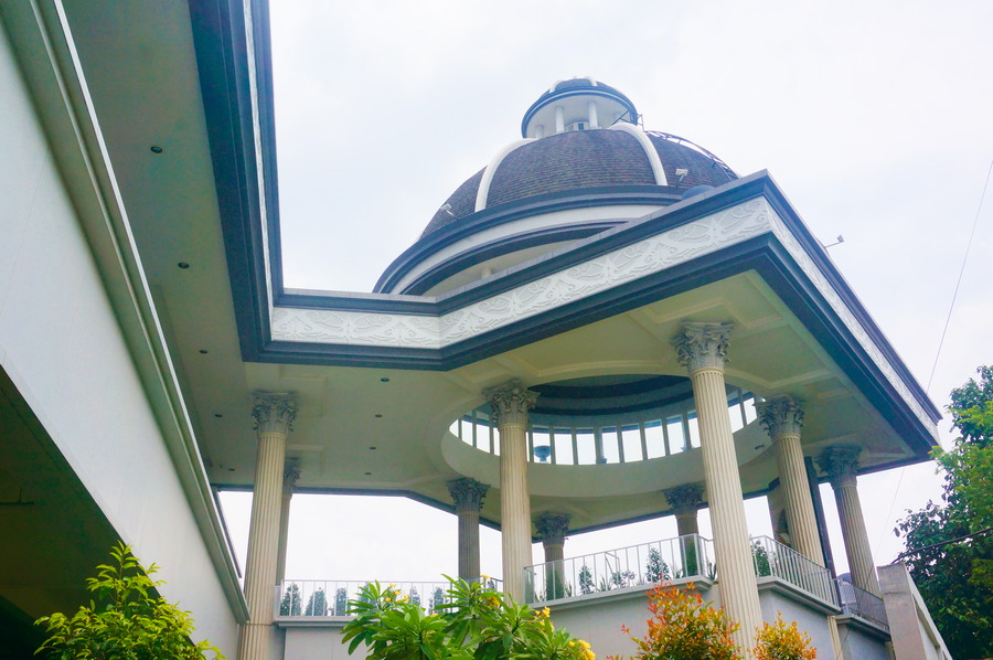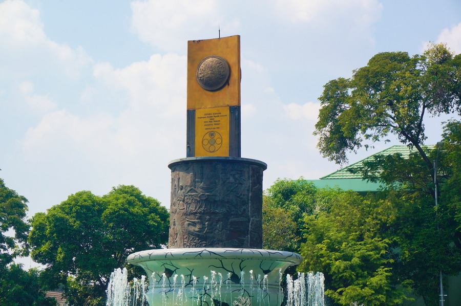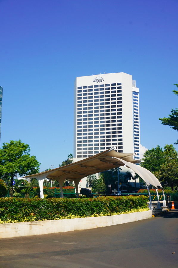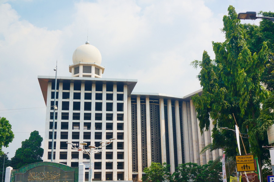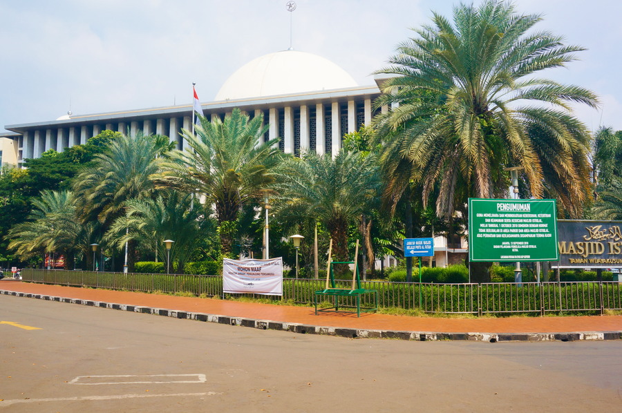 On ne pense pas forcément en premier à l’Indonésie quand on pense à l’islam et pourtant, c’est le plus grand pays musulman au monde avec 228’625’000 fidèles soit 87,2% de toute la population indonésienne, ce qui représente plus de douze pour cent de tous les musulmans dans le monde. C’est donc logique de trouver à Jakarta la plus grande mosquée d’Asie du Sud-Est qui peut accueillir plus de 110’000 personnes. Les travaux de construction ont commencé en 1964 et l’architecture représente bien le style, vraiment affreux, de l’époque. Nous ne sommes pas du tout dans la jolie ambiance des « Mille et Une Nuits » du Moyen-Orient! Heureusement qu’il y a une haie de palmiers pour dissimuler un peu cette horrible façade!