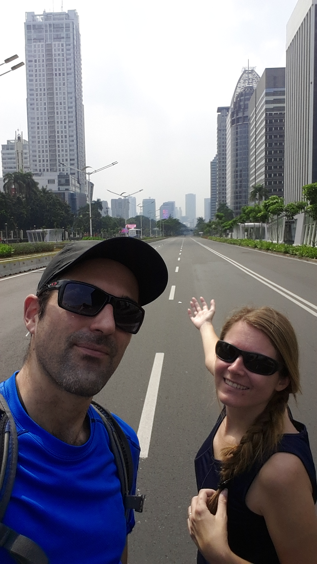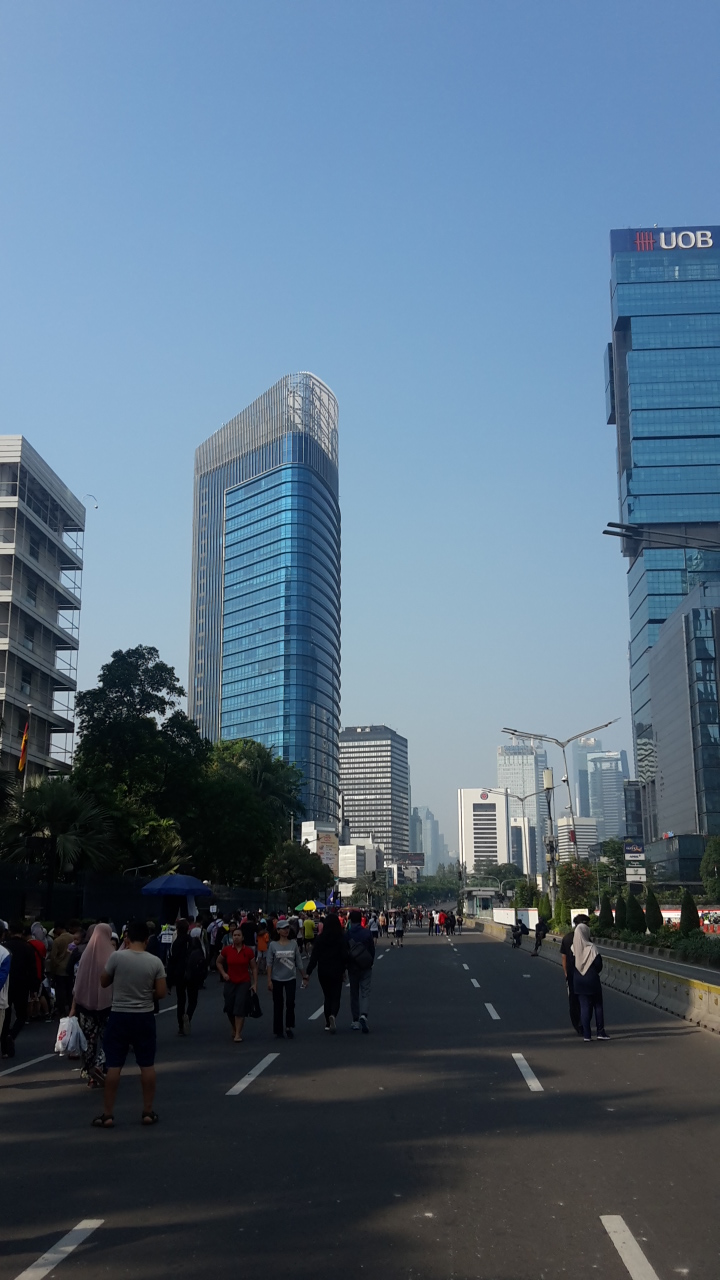 Il y a douze ans, Van avait déjà passé par Jakarta et y avait trouvé un véritable enfer sur terre : ville anarchique couverte par le smog, infrastructures inexistantes, trafic infernal, etc! C’était déjà une bonne surprise de voir que des aménagements ont été crées comme des trottoirs, un métro flambant neuf, des quartiers agréables et des passages piétons! Mais quand nous avons découvert que le dimanche matin le centre-ville est interdit aux véhicules, nous n’en avons pas cru nos yeux! Nous avons enfilé nos baskets pour aller voir ça de plus près et effectivement, les habitants se réapproprient la ville à pied, en vélo, en roller ou à trottinette et certains marchands en profitent pour monter leur stand au milieu de la route. Vers dix heures, quand la chaleur commence vraiment à devenir insupportable, les gens se cachent à l’ombre laissant d’immenses avenues complètement vides et une ambiance surréaliste! Sachant que l’Indonésie est un des pires pays en matière d’écologie, ça redonne foi en l’être humain de voir des actions telles que celles-ci.
