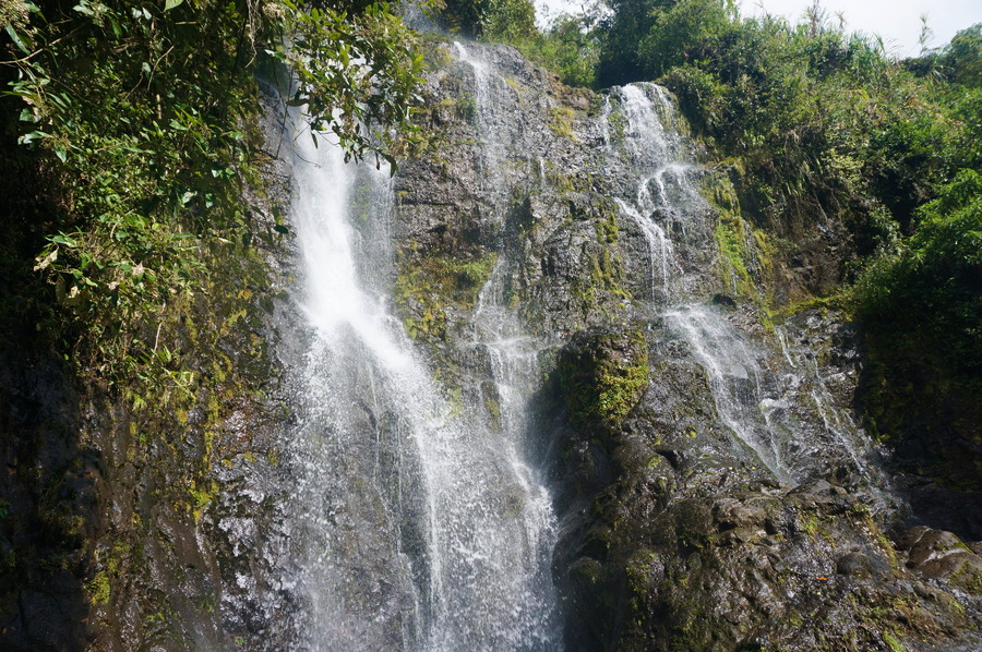 La moto-chiva nous dépose au chemin d’accès de la cascade. Ça grimpe un peu mais ça n’a rien de difficile et nous atteignons notre but en une petite dizaine de minutes. La cascade, haute de soixante mètres environ, s’appelle ainsi (escalier en français) car l’eau a formé avec l’érosion de petits paliers sur la roche faisant penser à un escalier.