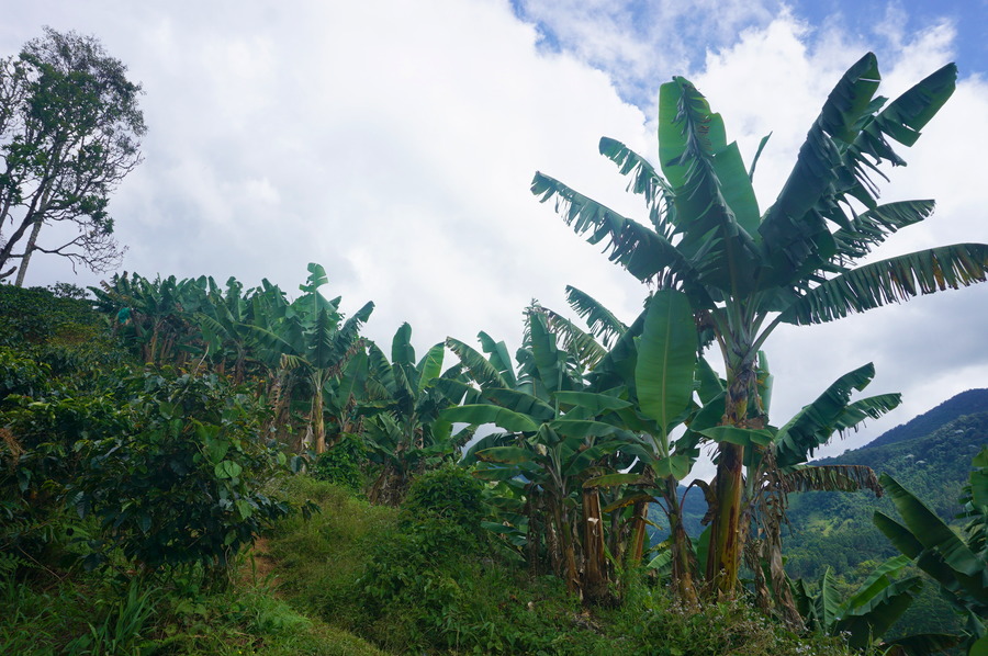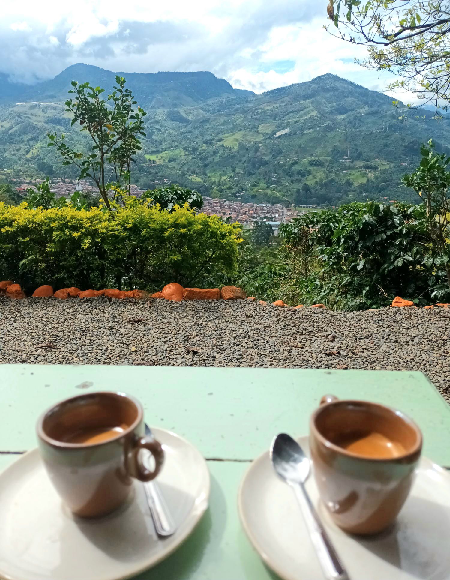 Depuis la cascade nous revenons sur nos pas puis continuons sur la route où le tuk-tuk nous a déposés. C’est facile, c’est une route carrossable juste non asphaltée et c’est presque tout plat! Le Café Jardín, comme son nom l’indique, est un café. Il surplombe le village de Jardín, au milieu des caféiers. Il propose d’ailleurs son propre café et, comme c’est une petite structure qui n’exporte pas sa production, il garde les meilleurs grains pour le servir aux clients de passage, comme nous. Du coup, le café est bien meilleur que le tinto de base qu’on peut trouver partout ailleurs. Il vaut la peine de s’y asseoir pour y admirer la vue, surtout que, vu la situation, les prix des consommations n’est pas trop surfait. Nous avons payé un espresso 3500 pesos (0,75€ ou 0,70 CHF) juste quelques centimes de plus qu’en ville.